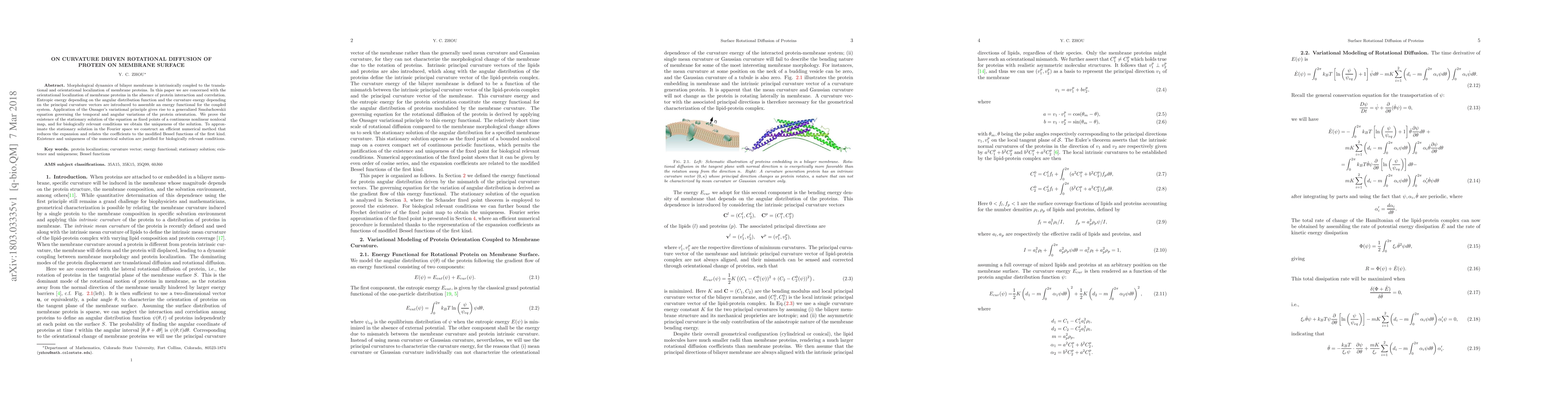 This paper investigates the rotational diffusion of proteins on a membrane surface driven by curvature, introducing an energy functional that combines entropic and curvature energies. It derives a generalized Smoluchowski equation and proves the existence and uniqueness of its stationary solution under biologically relevant conditions, along with an efficient numerical method for approximation.