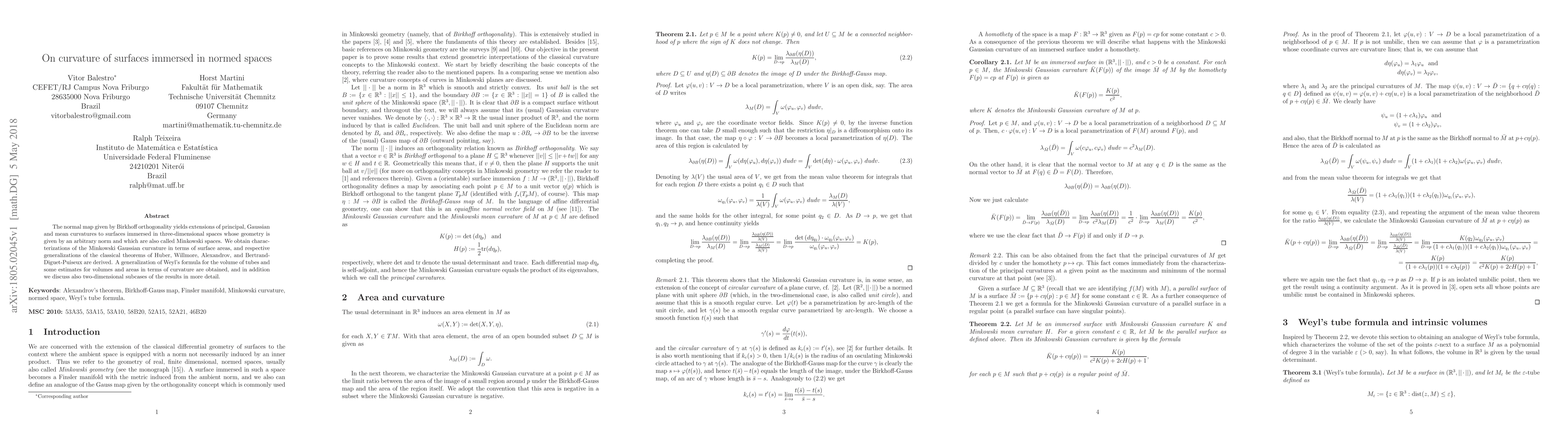 The normal map given by Birkhoff orthogonality yields extensions of principal, Gaussian and mean curvatures to surfaces immersed in three-dimensional spaces whose geometry is given by an arbitrary norm and which are also called Minkowski spaces. We obtain characterizations of the Minkowski Gaussian curvature in terms of surface areas, and respective generalizations of the classical theorems of Huber, Willmore, Alexandrov, and Bertrand-Diguet-Puiseux are derived. A generalization of Weyl's formula for the volume of tubes and some estimates for volumes and areas in terms of curvature are obtained, and in addition we discuss also two-dimensional subcases of the results in more detail.