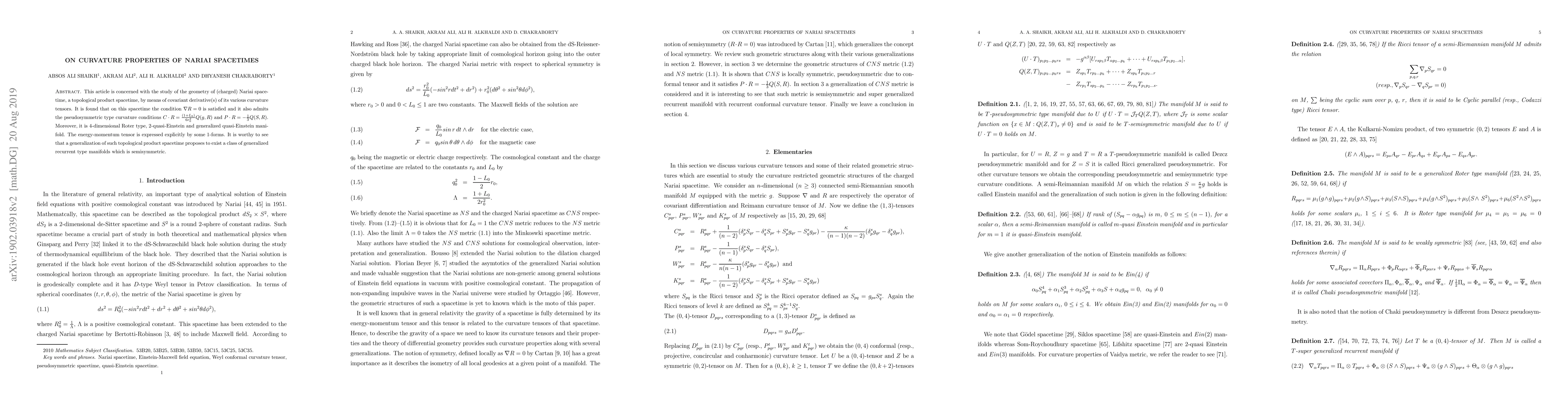 This paper investigates curvature properties of charged Nariai spacetimes, finding they exhibit local symmetry, 2-quasi-Einstein properties, and Ricci generalized projectively pseudosymmetric conditions, with implications for the classification of recurrent manifolds.