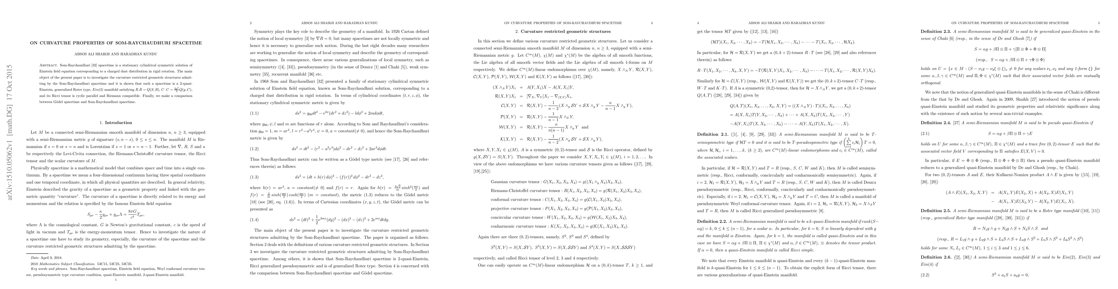 Som-Raychaudhuri spacetime is a stationary cylindrical symmetric solution of Einstein field equation corresponding to a charged dust distribution in rigid rotation. The main object of the present paper is to investigate the curvature restricted geometric structures admitting by the Som-Raychaudhuri spacetime and it is shown that such a spacetime is a 2-quasi-Einstein, generalized Roter type, $Ein(3)$ manifold satisfying $R.R = Q(S,R)$, $C\cdot C = \frac{2a^2}{3} Q(g,C)$, and its Ricci tensor is cyclic parallel and Riemann compatible. Finally, we make a comparison between G\"odel spacetime and Som-Raychaudhuri spacetime.