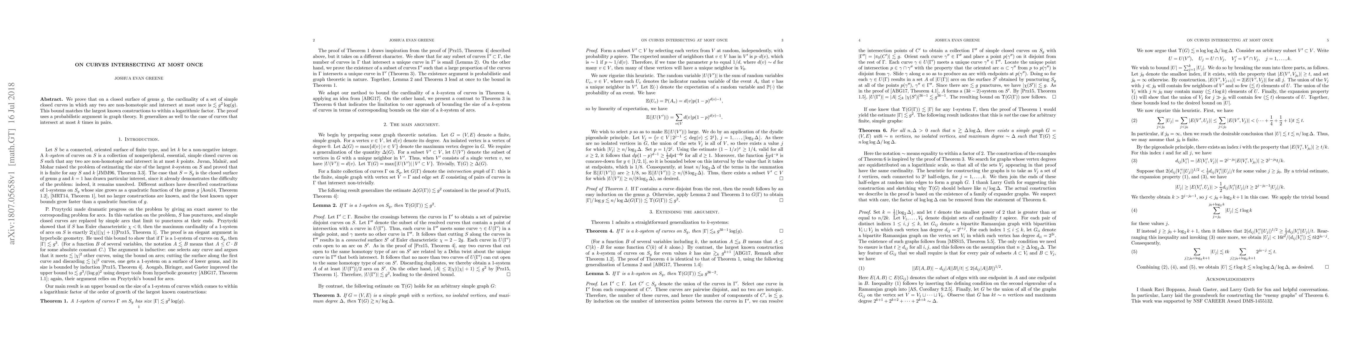 Summary: The paper proves that on a closed surface of genus $g$, the maximum number of simple closed curves that can intersect at most once is $\lesssim g^2 \log(g)$, matching the largest known constructions. The proof employs a probabilistic argument in graph theory and extends to curves intersecting at most $k$ times.
