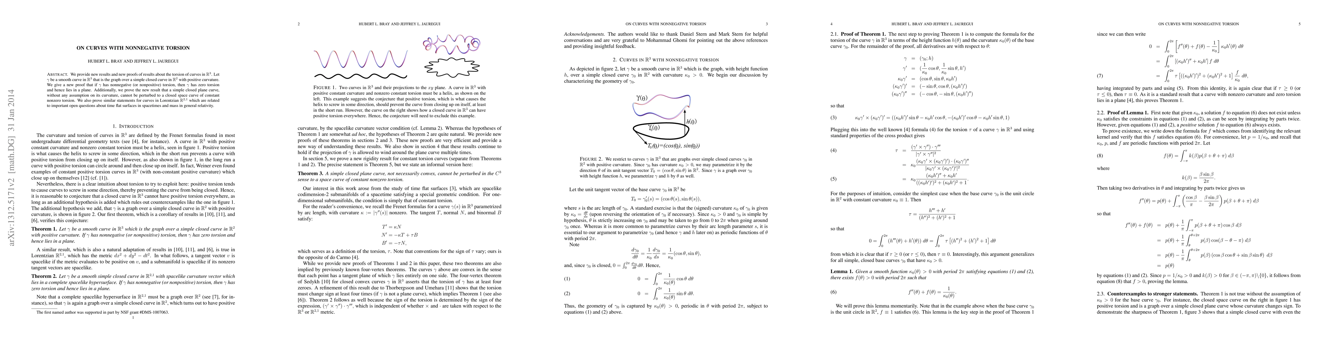 This paper presents new proofs and results regarding the torsion of curves in $\mathbb{R}^3$, showing that curves with nonnegative torsion lie in a plane and cannot be perturbed to have constant nonzero torsion. It also extends these findings to Lorentzian $\mathbb{R}^{2,1}$ relevant to general relativity.