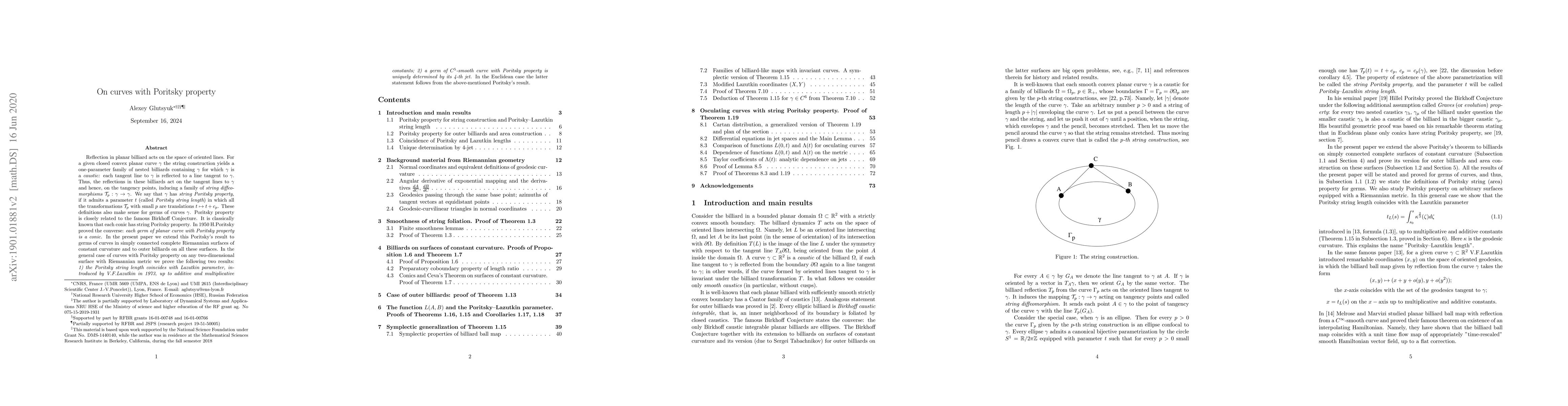 For a given closed convex planar curve $\gamma$ with smooth boundary and a given $p>0$, the string construction yields a family of nested billiards $\Gamma_p$ for which $\gamma$ is a caustic. The action of the corresponding reflections $T_p$ on the tangent lines to $\gamma$ induces their actions on the tangency points: a family of string diffeomorphisms $\mathcal T_p:\gamma\to\gamma$. We say that $\gamma$ has string Poritsky property, if it admits a parameter $t$ (called Poritsky string length) in which all the transformations $\mathcal T_p$ with small $p$ are translations $t\mapsto t+c_p$. These definitions also make sense for germs of curves $\gamma$. Poritsky property is closely related to the famous Birkhoff Conjecture. It is classically known that each conic has string Poritsky property. In 1950 H.Poritsky proved the converse: each germ of planar curve with Poritsky property is a conic. In the present paper we extend this Poritsky's result to germs of curves on simply connected complete surfaces with Riemannian metric of constant curvature and to outer billiards on all these surfaces. In the general case of curves with Poritsky property on any two-dimensional surface with Riemannian metric we prove the two following results: 1) the Poritsky string length coincides with Lazutkin parameter, introduced by V.F.Lazutkin in 1973, up to additive and multiplicative constants; 2) a germ of $C^5$-smooth curve with Poritsky property is uniquely determined by its 4-th jet. In the Euclidean case the latter statement follows from the above-mentioned Poritsky's result.