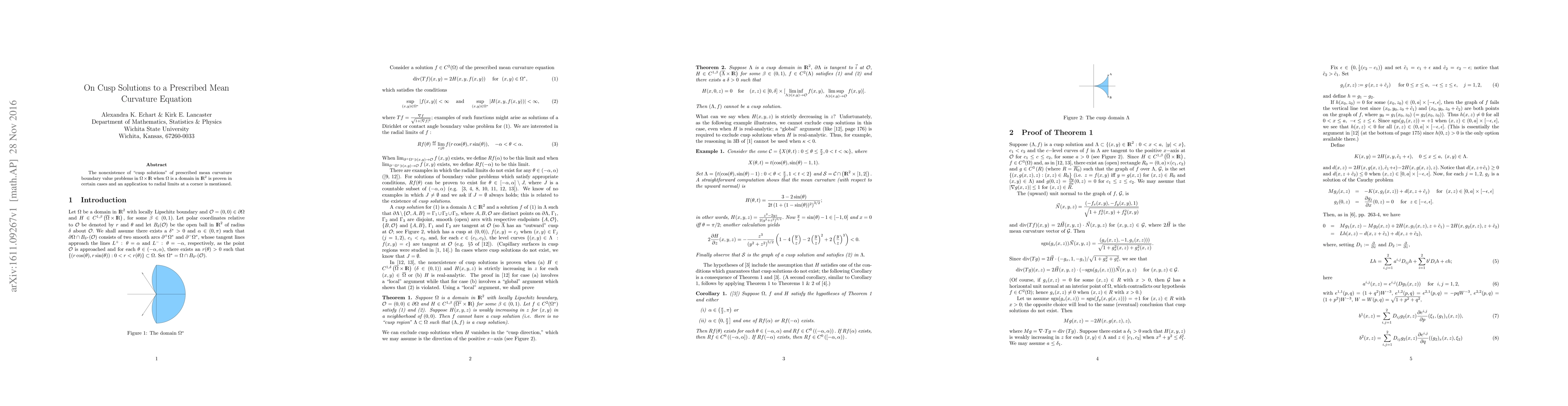 The nonexistence of "cusp solutions" of prescribed mean curvature boundary value problems in $\Omega\times{\bf R}$ when $\Omega$ is a domain in ${\bf R}^{2}$ is proven in certain cases and an application to radial limits at a corner is mentioned.