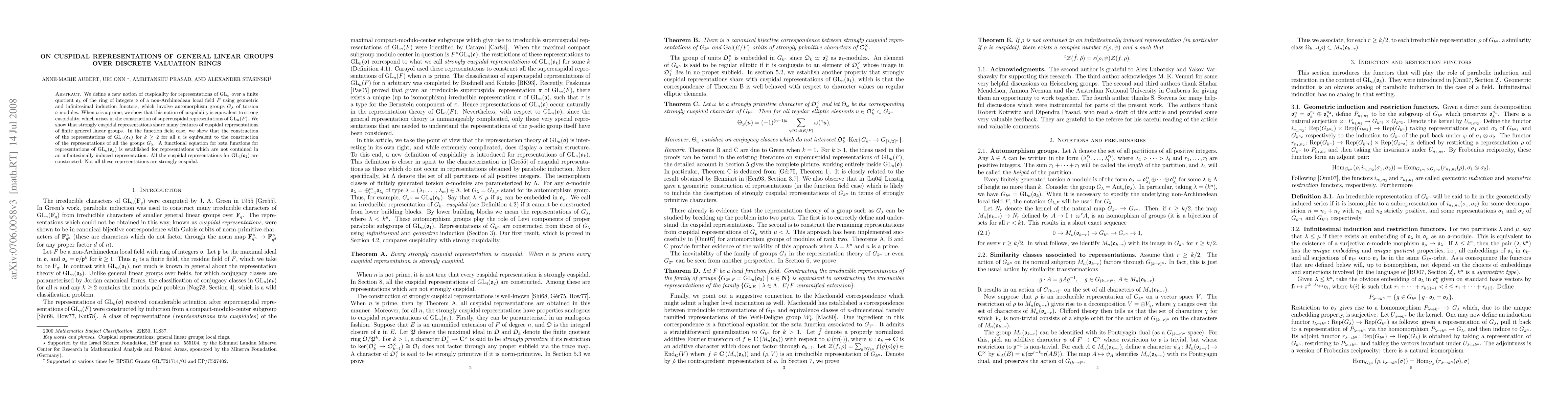 We define a new notion of cuspidality for representations of $\GL_n$ over a finite quotient $\Oh_k$ of the ring of integers $\Oh$ of a non-Archimedean local field $F$ using geometric and infinitesimal induction functors, which involve automorphism groups $G_\lambda$ of torsion $\Oh$\nobreakdash-modules. When $n$ is a prime, we show that this notion of cuspidality is equivalent to strong cuspidality, which arises in the construction of supercuspidal representations of $\GL_n(F)$. We show that strongly cuspidal representations share many features of cuspidal representations of finite general linear groups. In the function field case, we show that the construction of the representations of $\GL_n(\Oh_k)$ for $k\geq 2$ for all $n$ is equivalent to the construction of the representations of all the groups $G_\lambda$. A functional equation for zeta functions for representations of $\GL_n(\Oh_k)$ is established for representations which are not contained in an infinitesimally induced representation. All the cuspidal representations for $\GL_4(\Oh_2)$ are constructed. Not all these representations are strongly cuspidal.