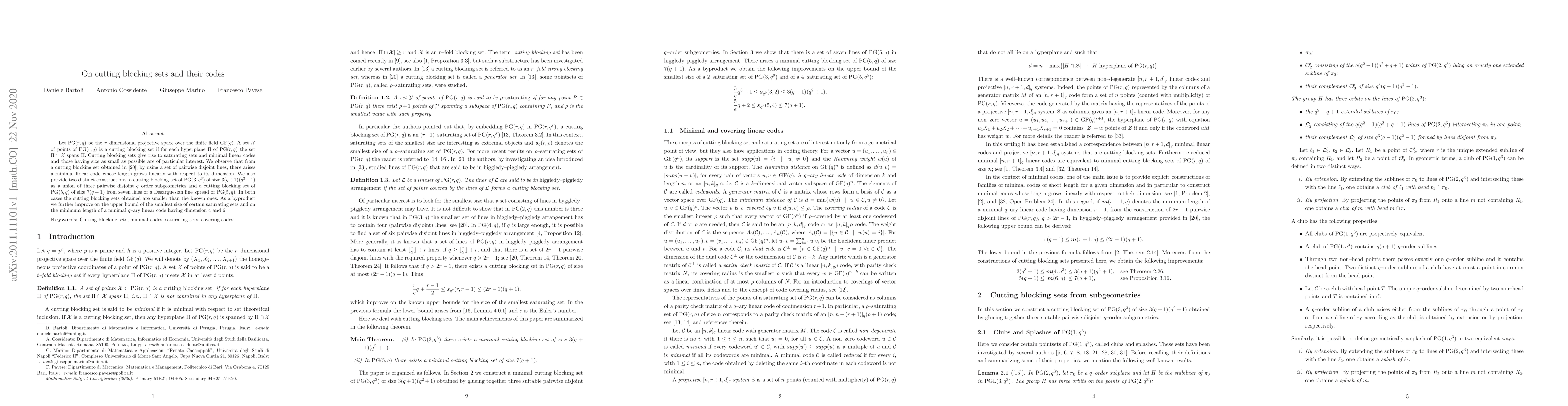 Let PG$(r, q)$ be the $r$-dimensional projective space over the finite field ${\rm GF}(q)$. A set $\cal X$ of points of PG$(r, q)$ is a cutting blocking set if for each hyperplane $\Pi$ of PG$(r, q)$ the set $\Pi \cap \cal X$ spans $\Pi$. Cutting blocking sets give rise to saturating sets and minimal linear codes and those having size as small as possible are of particular interest. We observe that from a cutting blocking set obtained by Fancsali and Sziklai, by using a set of pairwise disjoint lines, there arises a minimal linear code whose length grows linearly with respect to its dimension. We also provide two distinct constructions: a cutting blocking set of PG$(3, q^3)$ of size $3(q+1)(q^2+1)$ as a union of three pairwise disjoint $q$-order subgeometries and a cutting blocking set of PG$(5, q)$ of size $7(q+1)$ from seven lines of a Desarguesian line spread of PG$(5, q)$. In both cases the cutting blocking sets obtained are smaller than the known ones. As a byproduct we further improve on the upper bound of the smallest size of certain saturating sets and on the minimum length of a minimal $q$-ary linear code having dimension $4$ and $6$.