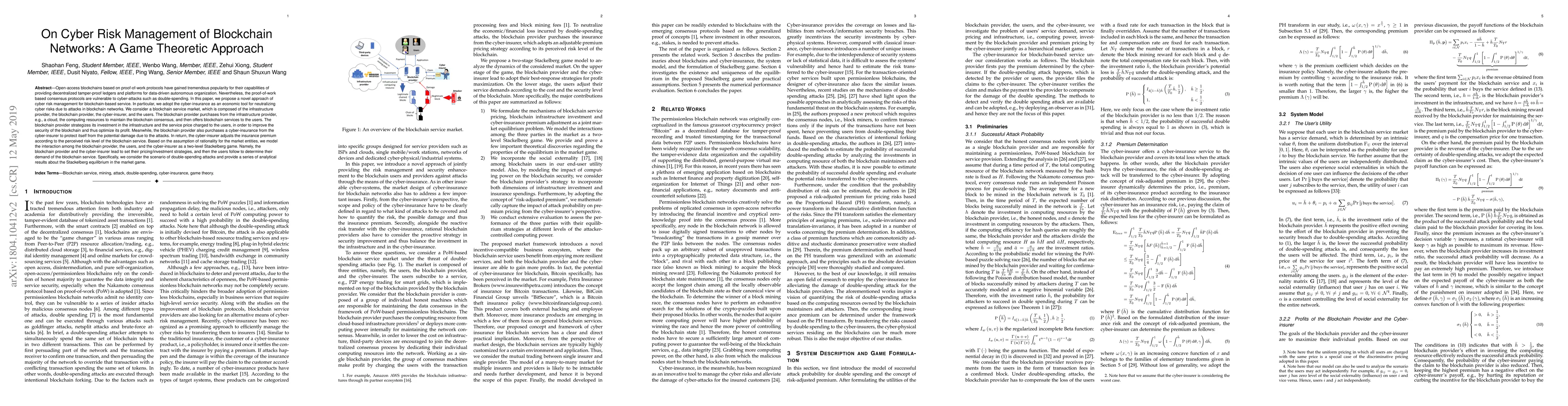 This paper proposes a game-theoretic approach to cyber risk management for blockchain networks, using cyber-insurance to mitigate risks from attacks like double-spending. It models the blockchain service market as a two-level Stackelberg game, with the blockchain provider and cyber-insurer setting strategies, followed by user demand, to optimize security and profit.