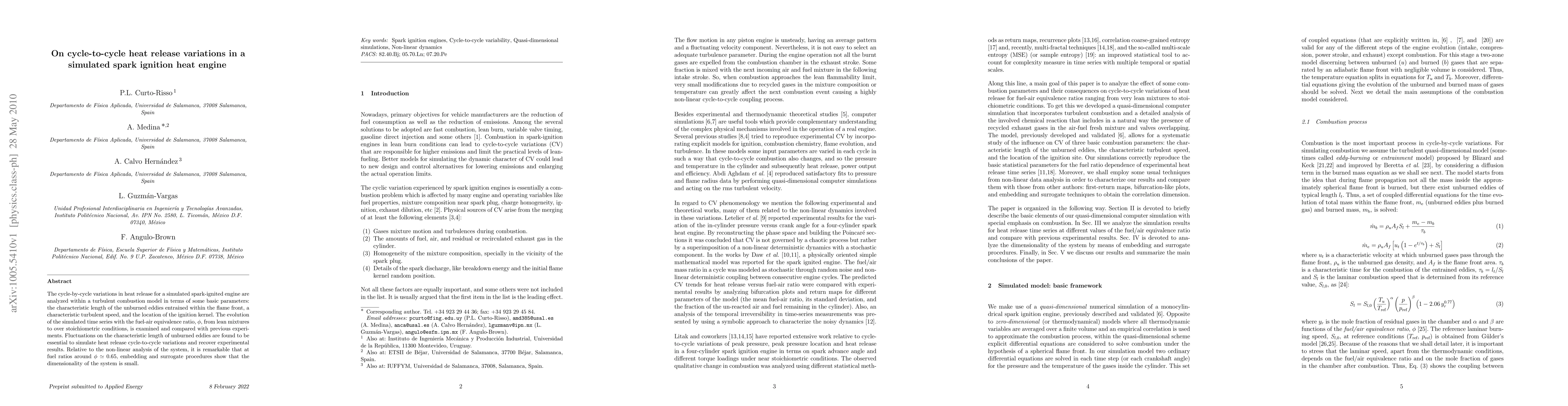The cycle-by-cycle variations in heat release for a simulated spark-ignited engine are analyzed within a turbulent combustion model in terms of some basic parameters: the characteristic length of the unburned eddies entrained within the flame front, a characteristic turbulent speed, and the location of the ignition kernel. The evolution of the simulated time series with the fuel-air equivalence ratio, phi, from lean mixtures to over stoichiometric conditions, is examined and compared with previous experiments. Fluctuations on the characteristic length of unburned eddies are found to be essential to simulate heat release cycle-to-cycle variations and recover experimental results. Relative to the non-linear analysis of the system, it is remarkable that at fuel ratios around phi=0.65, embedding and surrogate procedures show that the dimensionality of the system is small.