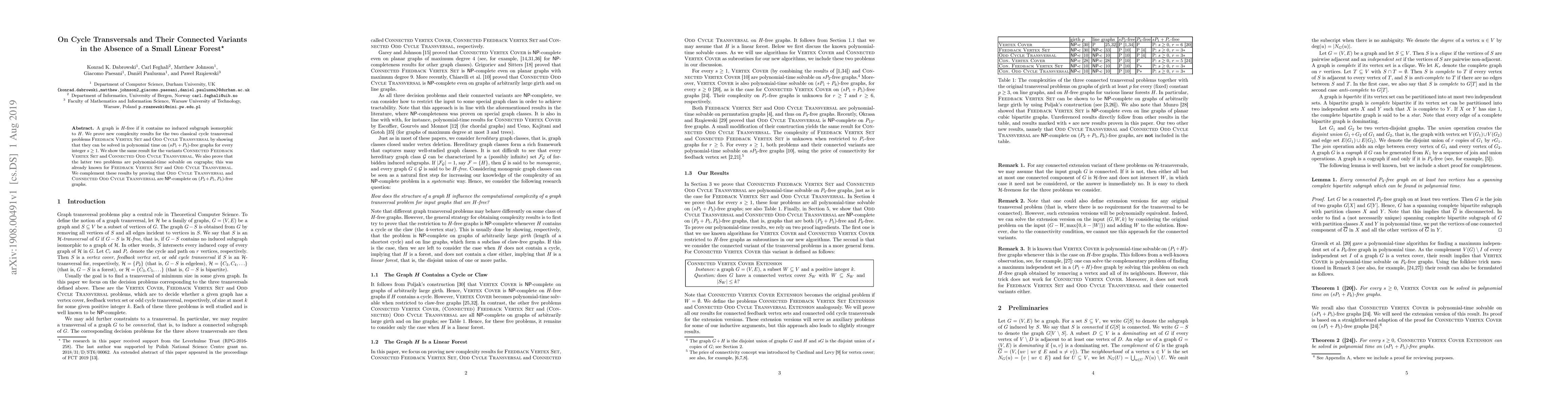 A graph is $H$-free if it contains no induced subgraph isomorphic to $H$. We prove new complexity results for the two classical cycle transversal problems Feedback Vertex Set and Odd Cycle Transversal by showing that they can be solved in polynomial time on $(sP_1+P_3)$-free graphs for every integer $s\geq 1$. We show the same result for the variants Connected Feedback Vertex Set and Connected Odd Cycle Transversal. We also prove that the latter two problems are polynomial-time solvable on cographs; this was already known for Feedback Vertex Set and Odd Cycle Transversal. We complement these results by proving that Odd Cycle Transversal and Connected Odd Cycle Transversal are NP-complete on $(P_2+P_5,P_6)$-free graphs.