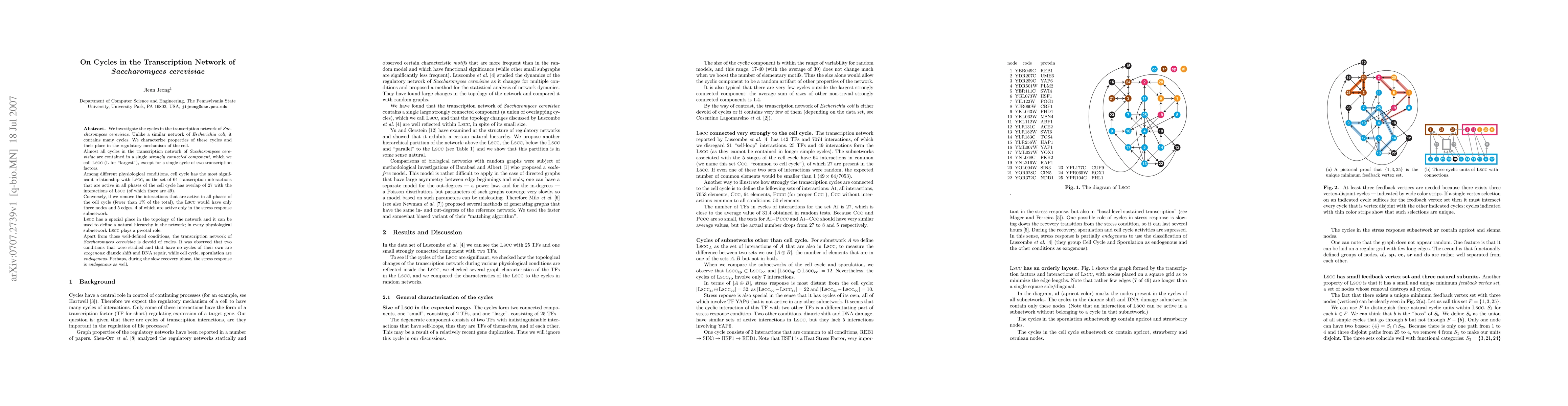 This study characterizes cycles in the transcription network of S. cerevisiae, revealing that almost all cycles are contained within a single largest strongly connected component (LSCC). The LSCC plays a pivotal role across various physiological conditions, especially during the cell cycle, where it overlaps significantly with active transcription interactions.