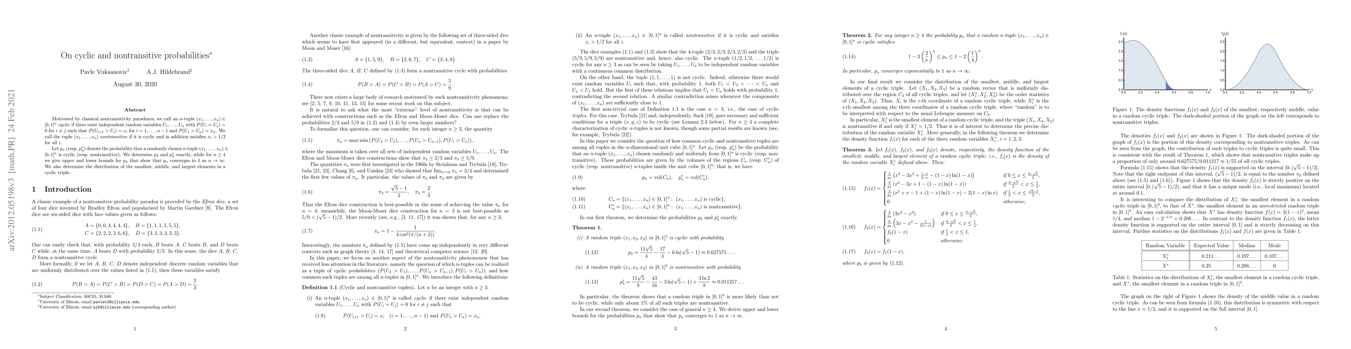 This research paper investigates cyclic and nontransitive probabilities, focusing on determining exact values for n=3, providing bounds for larger n, and analyzing the distribution of elements in a cyclic triple.