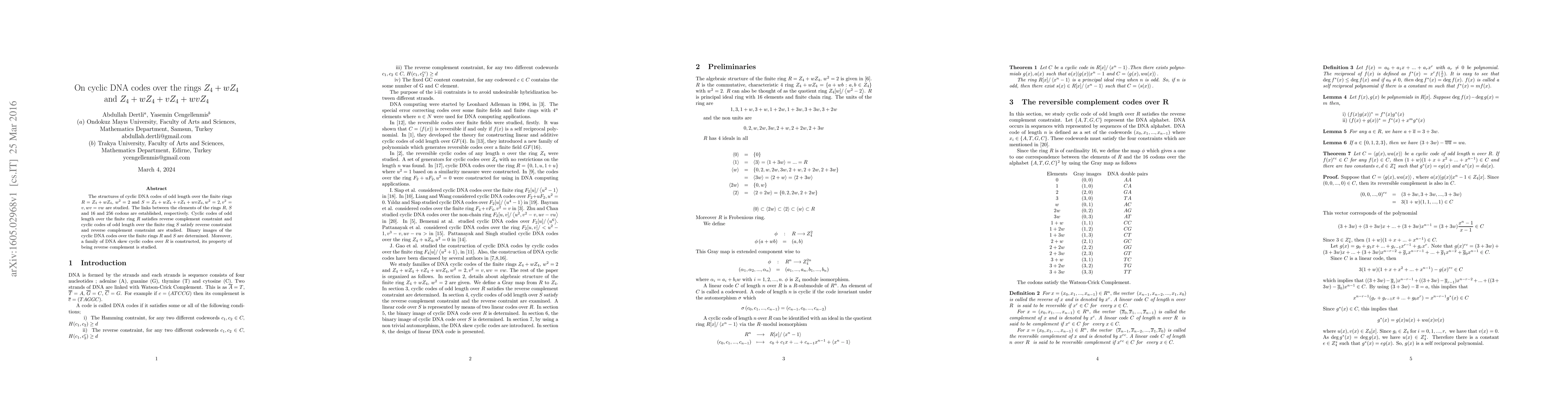 This paper investigates cyclic DNA codes of odd length over two finite rings: R = Z_{4}+wZ_{4} and S = Z_{4}+wZ_{4}+vZ_{4}+wvZ_{4}. It establishes connections between the rings and DNA codons, studying constraints and binary representations of these codes.