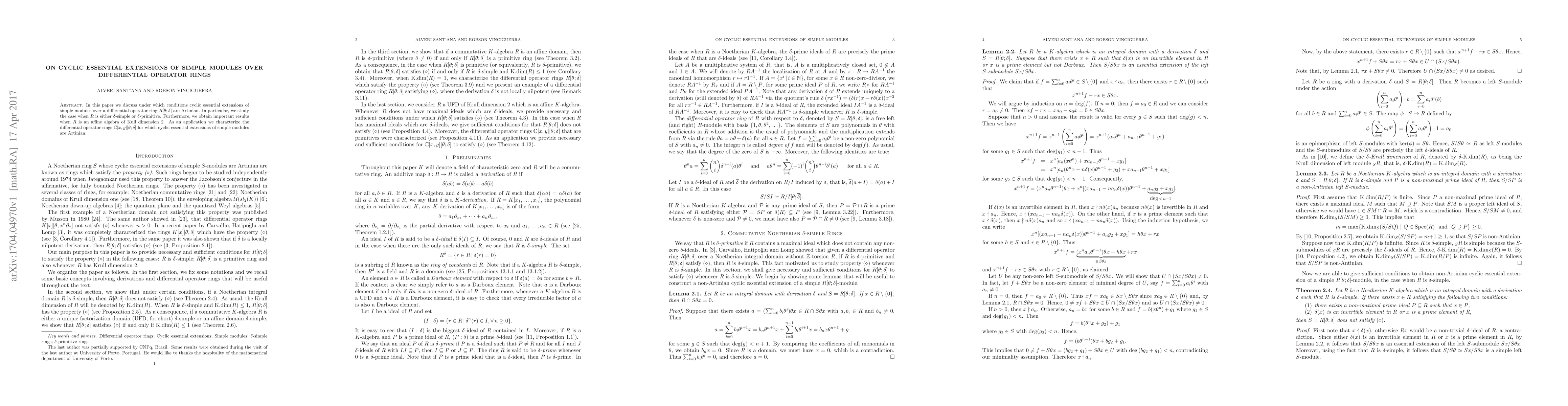 This paper explores conditions under which cyclic essential extensions of simple modules over differential operator rings, specifically R[z;d], are Artinian, focusing on d-simple or d-primitive cases and affine algebras of Kull dimension 2. It characterizes the differential operator rings C[x,y][z;d] where such extensions are Artinian.