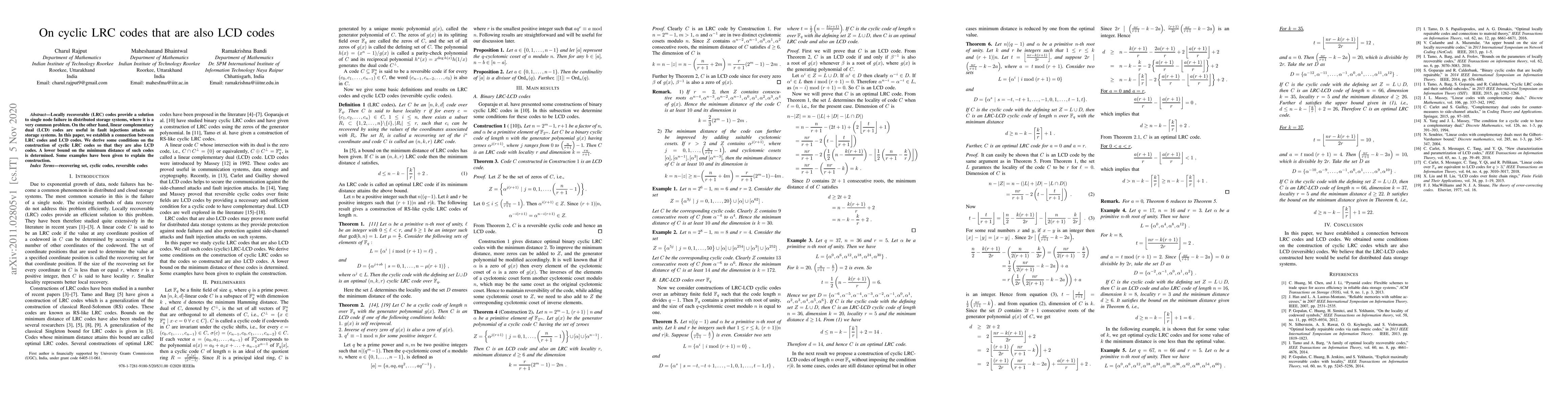 Locally recoverable (LRC) codes provide a solution to single node failure in distributed storage systems, where it is a very common problem. On the other hand, linear complementary dual (LCD) codes are useful in fault injections attacks on storage systems. In this paper, we establish a connection between LRC codes and LCD codes. We derive some conditions on the construction of cyclic LRC codes so that they are also LCD codes. A lower bound on the minimum distance of such codes is determined. Some examples have been given to explain the construction.