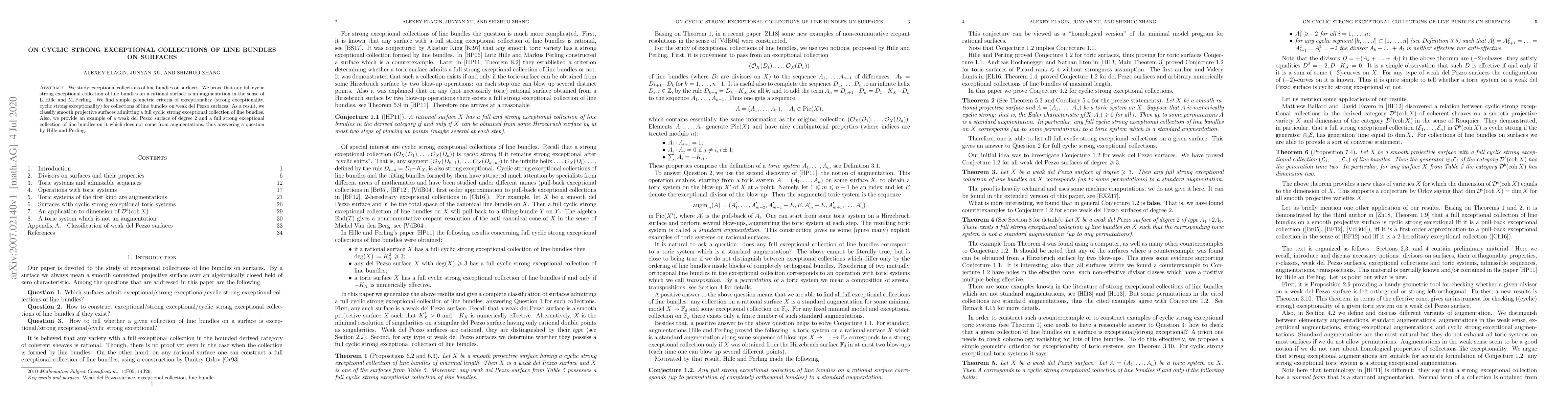 This paper classifies smooth projective surfaces with full cyclic strong exceptional collections of line bundles, proving that such collections on rational surfaces are augmentations. It also introduces geometric criteria for strong exceptionality on weak del Pezzo surfaces and provides an example of a degree 2 weak del Pezzo surface with a non-augmentation-derived strong exceptional collection.