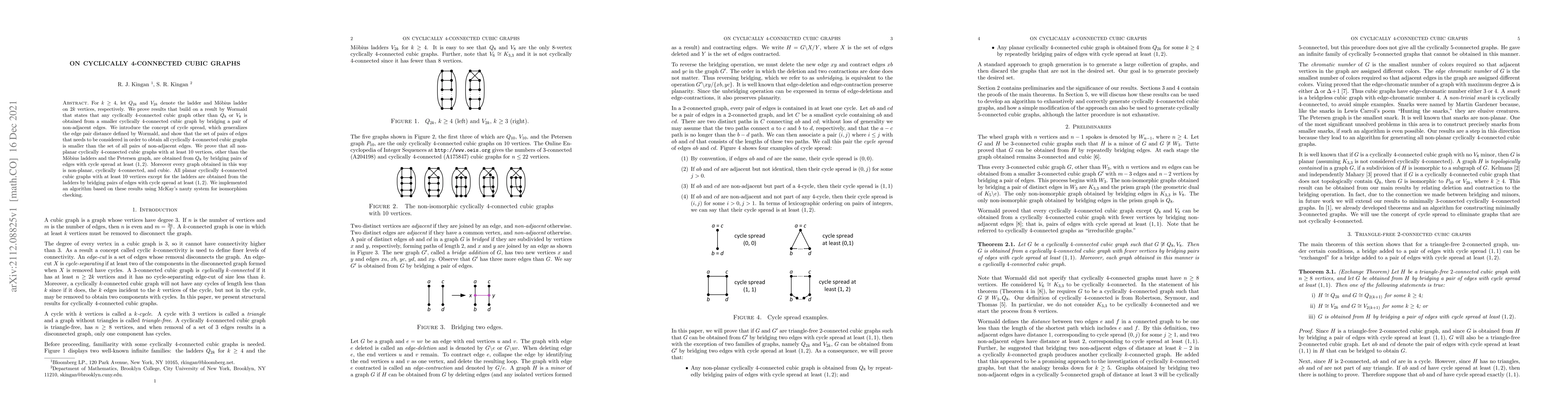 For $k \ge 4$, let $Q_{2k}$ and $V_{2k}$ denote the ladder and M\"obius ladder on $2k$ vertices, respectively. We prove results that build on a result by Wormald that states that any cyclically $4$-connected cubic graph other than $Q_8$ or $V_8$ is obtained from a smaller cyclically $4$-connected cubic graph by bridging a pair of non-adjacent edges. We introduce the concept of cycle spread, which generalizes the edge pair distance defined by Wormald, and show that the set of pairs of edges that needs to be considered in order to obtain all cyclically $4$-connected cubic graphs is smaller than the set of all pairs of non-adjacent edges. We prove that all non-planar cyclically $4$-connected cubic graphs with at least $10$ vertices, other than the M\"obius ladders and the Petersen graph, are obtained from $Q_8$ by bridging pairs of edges with cycle spread at least $(1,2)$. Moreover every graph obtained in this way is non-planar, cyclically $4$-connected, and cubic. All planar cyclically $4$-connected cubic graphs with at least $10$ vertices except for the ladders are obtained from the ladders by bridging pairs of edges with cycle spread at least $(1,2)$. We implemented an algorithm based on these results using McKay's nauty system for isomorphism checking.