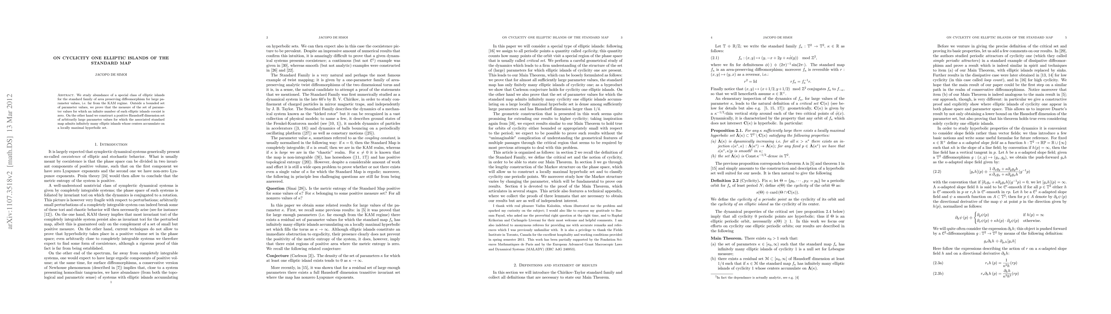 Researchers found that certain areas of parameter values for Standard family area preserving diffeomorphisms have zero Lebesgue measure where infinitely many elliptic islands coexist, but also discovered sets with positive Hausdorff dimension where infinitely many cyclicity one islands accumulate on a hyperbolic set.