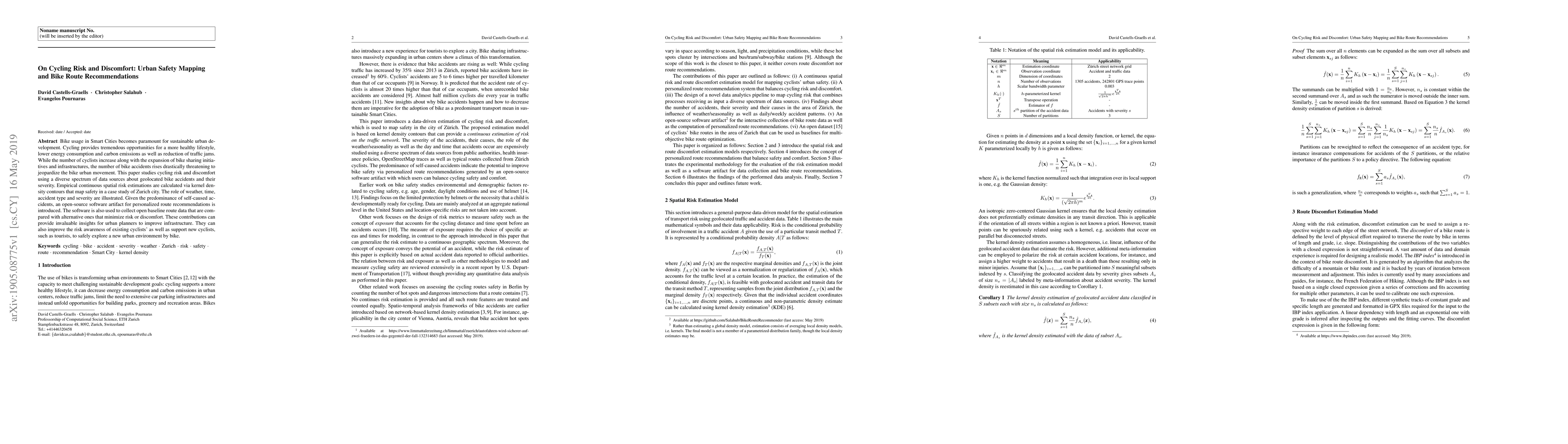 This paper investigates cycling risk and discomfort in Zurich using geolocated bike accident data, employing kernel density estimations to map safety. It introduces an open-source tool for personalized bike route recommendations based on risk minimization, aiming to enhance urban safety and support sustainable urban development.