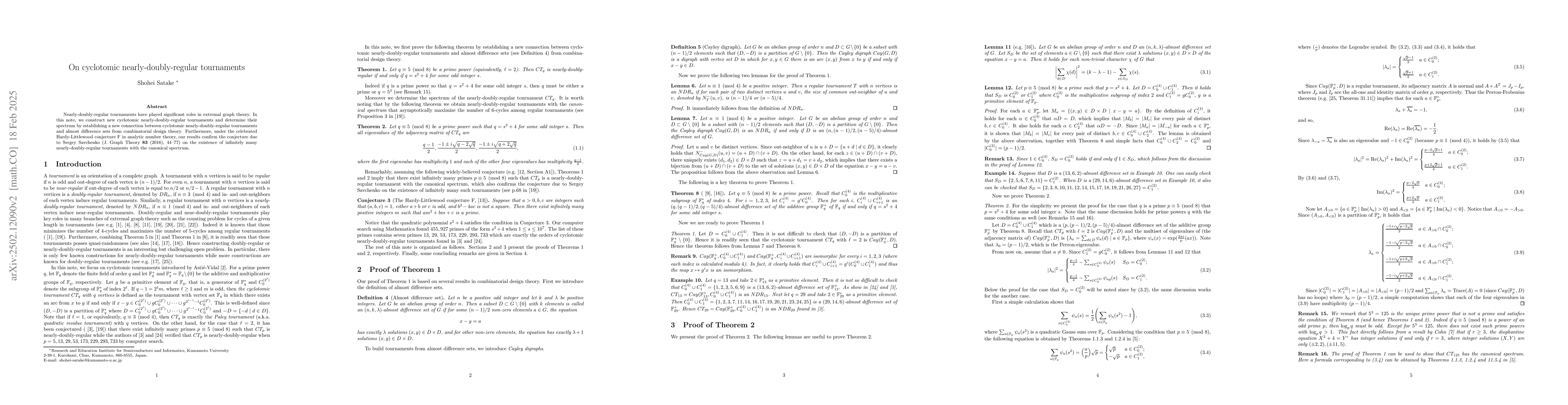 The paper introduces a novel method for constructing cyclotomic nearly-doubly-regular tournaments and determining their spectra using almost difference sets, linking analytic number theory with extremal graph theory.
