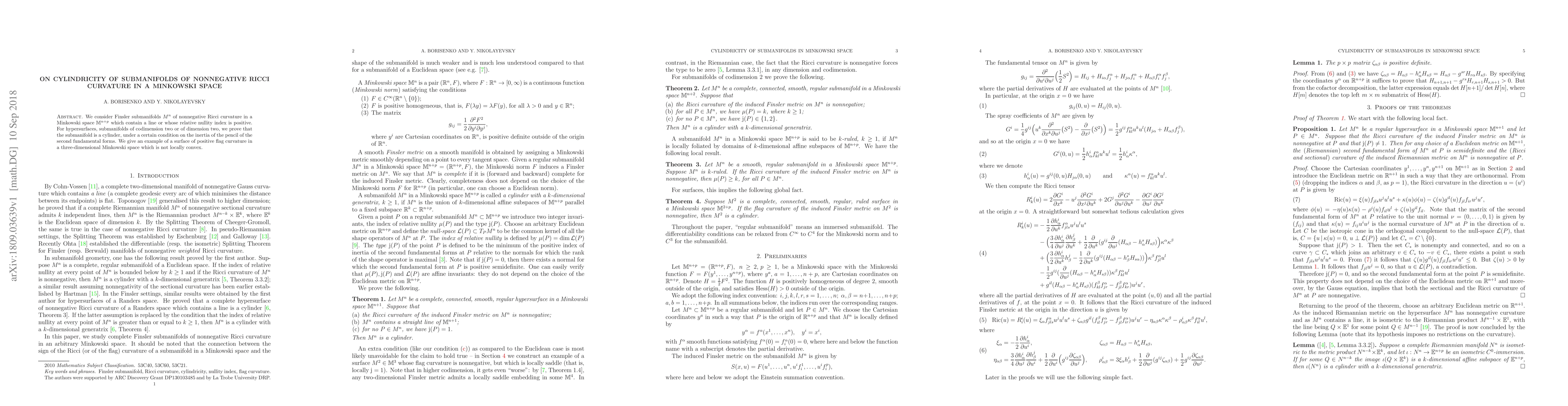 This paper proves that certain Finsler submanifolds of nonnegative Ricci curvature in Minkowski space are cylindrical, specifically for hypersurfaces and submanifolds of codimension two or dimension two, under specific conditions. It also provides an example of a surface with positive flag curvature that is not locally convex.