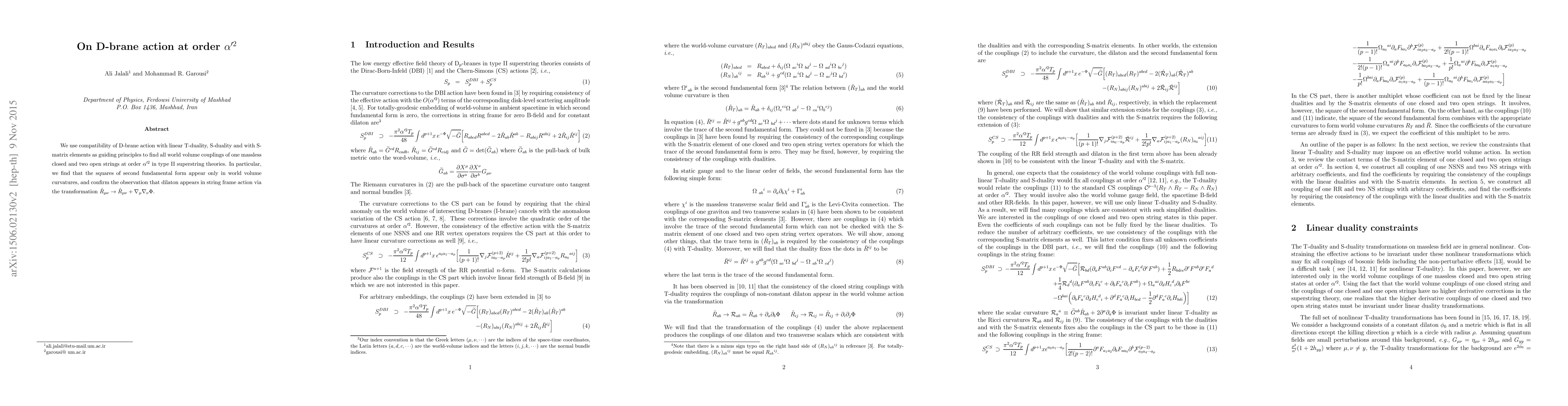 We use compatibility of D-brane action with linear T-duality, S-duality and with S-matrix elements as guiding principles to find all world volume couplings of one massless closed and two open strings at order $\alpha'^2$ in type II superstring theories. In particular, we find that the squares of second fundamental form appear only in world volume curvatures, and confirm the observation that dilaton appears in string frame action via the transformation $\hat{R}_{\mu\nu}\rightarrow \hat{R}_{\mu\nu}+\nabla_{\mu}\nabla_{\nu}\Phi$.