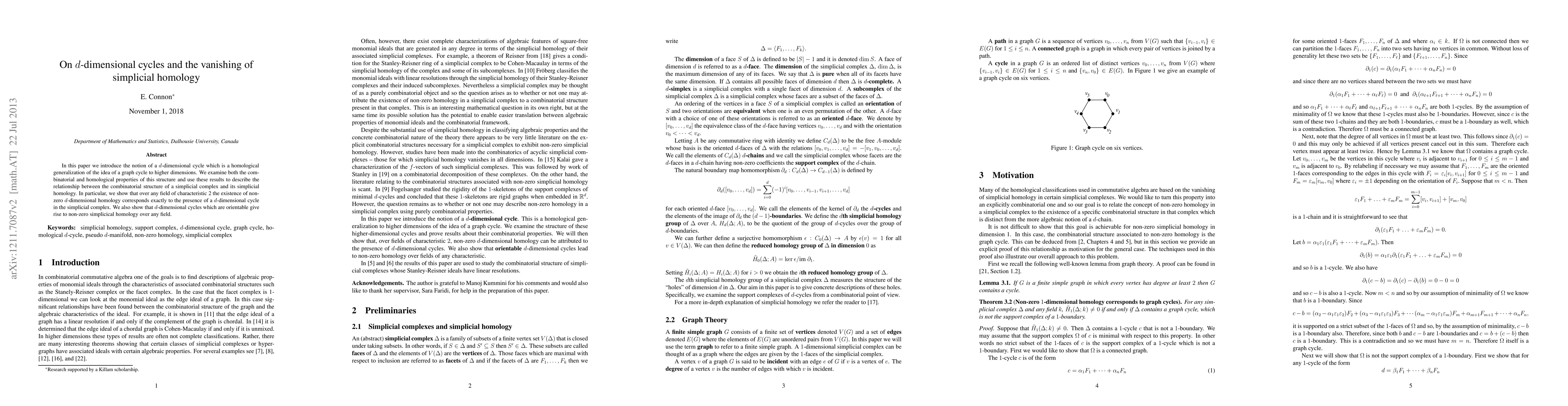 This paper introduces $d$-dimensional cycles in simplicial complexes, showing that non-zero homology exists if and only if a cycle of dimension $d$ is present, with orientable cycles giving rise to non-zero homology regardless of field characteristic.