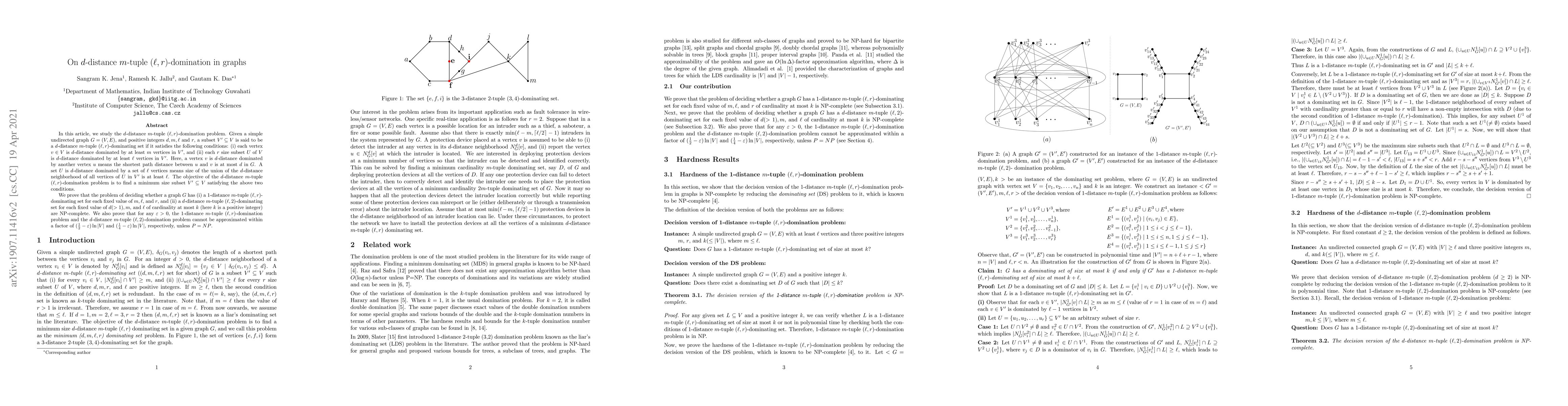 In this article, we study the $d$-distance $m$-tuple ($\ell, r$)-domination problem. Given a simple undirected graph $G=(V, E)$, and positive integers $d, m, \ell$ and $r$, a subset $V' \subseteq V$ is said to be a $d$-distance $m$-tuple ($\ell, r$)-dominating set if it satisfies the following conditions: (i) each vertex $v \in V$ is $d$-distance dominated by at least $m$ vertices in $V'$, and (ii) each $r$ size subset $U$ of $V$ is $d$-distance dominated by at least $\ell$ vertices in $V'$. Here, a vertex $v$ is $d$-distance dominated by another vertex $u$ means the shortest path distance between $u$ and $v$ is at most $d$ in $G$. A set $U$ is $d$-distance dominated by a set of $\ell$ vertices means size of the union of the $d$-distance neighborhood of all vertices of $U$ in $V'$ is at least $\ell$. The objective of the $d$-distance $m$-tuple ($\ell, r$)-domination problem is to find a minimum size subset $V' \subseteq V$ satisfying the above two conditions. We prove that the problem of deciding whether a graph $G$ has (i) a 1-distance $m$-tuple ($\ell, r$)-dominating set for each fixed value of $m, \ell$, and $r$, and (ii) a $d$-distance $m$-tuple ($\ell, 2$)-dominating set for each fixed value of $d (> 1), m$, and $\ell$ of cardinality at most $k$ (here $k$ is a positive integer) are NP-complete. We also prove that for any $\varepsilon>0$, the 1-distance $m$-tuple $(\ell, r)$-domination problem and the $d$-distance $m$-tuple $(\ell,2)$-domination problem cannot be approximated within a factor of $(\frac{1}{2}- \varepsilon)\ln |V|$ and $(\frac{1}{4}- \varepsilon)\ln |V|$, respectively, unless $P = NP$.