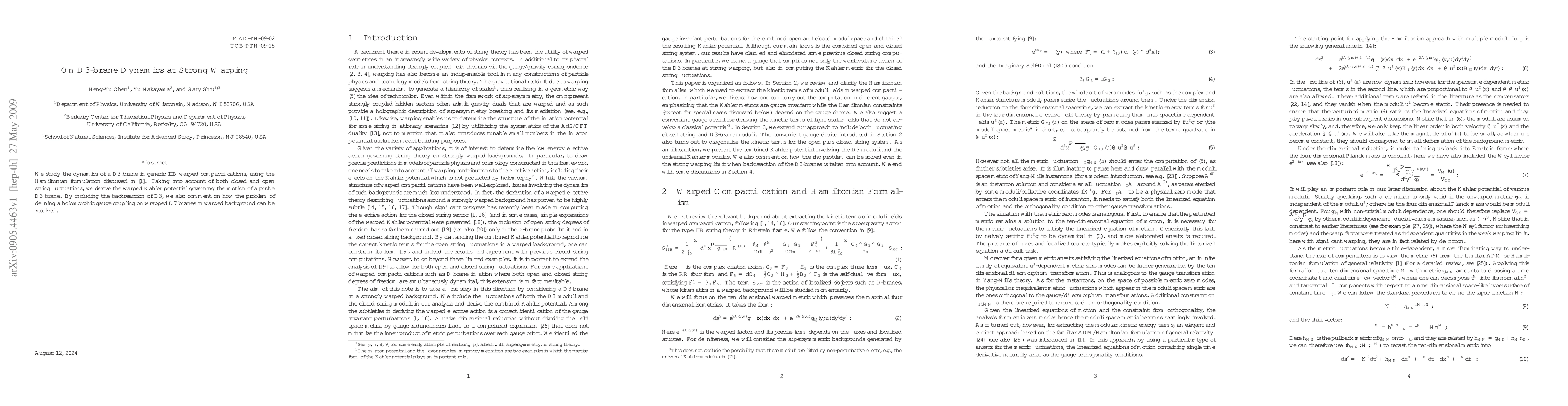 This paper investigates the dynamics of a D3 brane in IIB string theory within warped compactifications, deriving the warped Kahler potential. It also addresses the resolution of defining a holomorphic gauge coupling on wrapped D7 branes in such backgrounds by considering the D3 brane's backreaction.