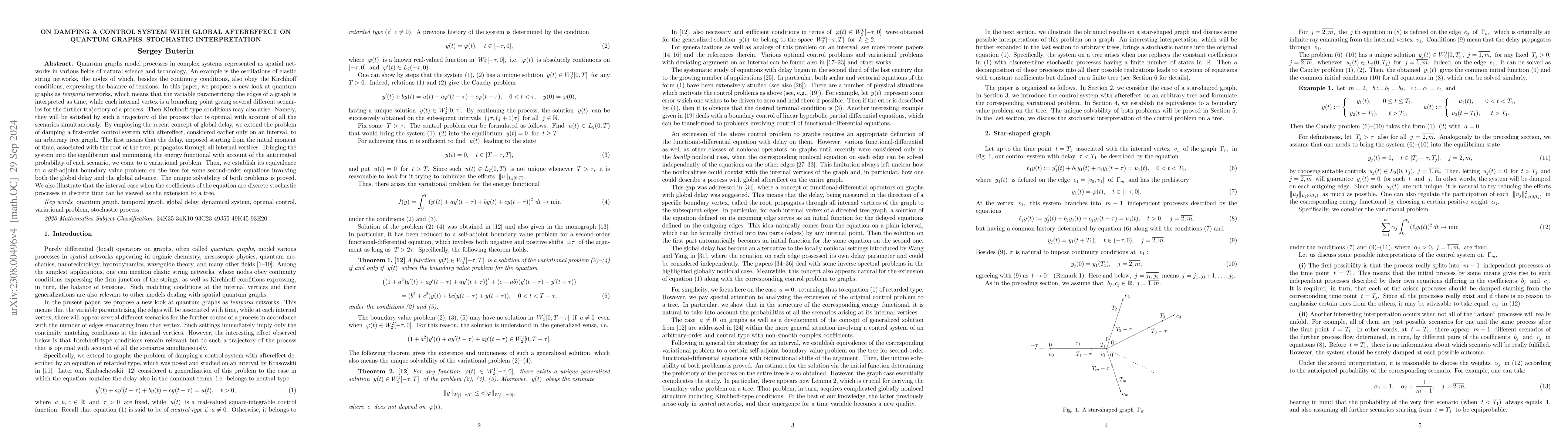 This paper extends the damping problem of a first-order control system with global delay to quantum graphs viewed as temporal networks, establishing a variational problem equivalent to a self-adjoint boundary value problem on the tree. The optimal trajectory obeys Kirchhoff-type conditions at internal vertices.