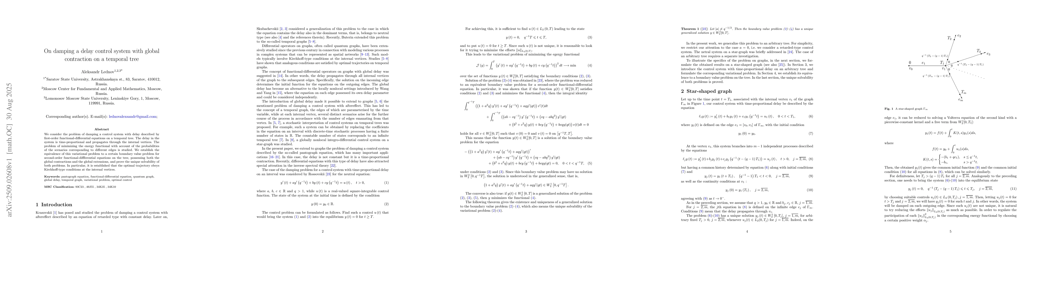 We consider the problem of damping a control system with delay described by first-order functional-differential equations on a temporal tree. The delay in the system is time-proportional and propagates through the internal vertices. The problem of minimizing the energy functional with account of the probabilities of the scenarios corresponding to different edges is studied. We establish the equivalence of this variational problem to a certain boundary value problem for second-order functional-diffferential equations on the tree, possessing both the global contractions and the global extensions, and prove the unique solvability of both problems. In particular, it is established that the optimal trajectory obeys Kirchhoff-type conditions at the internal vertices.