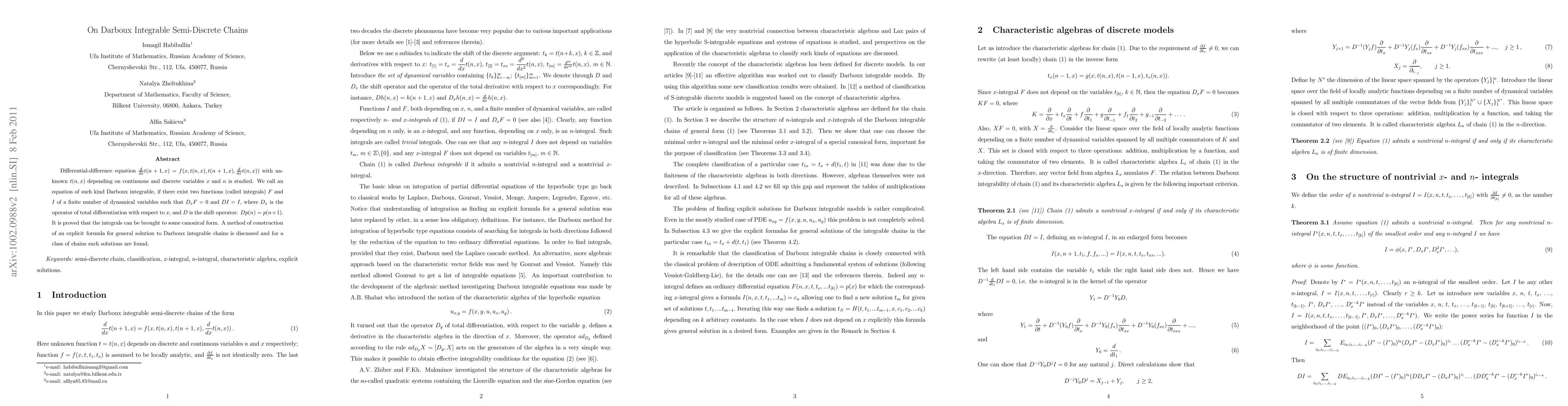 This paper investigates semi-discrete chains of differential-difference equations and defines Darboux integrability through specific functions. It proves that these integrable equations can be expressed in a canonical form and provides a method for constructing explicit solutions for certain classes of these chains.