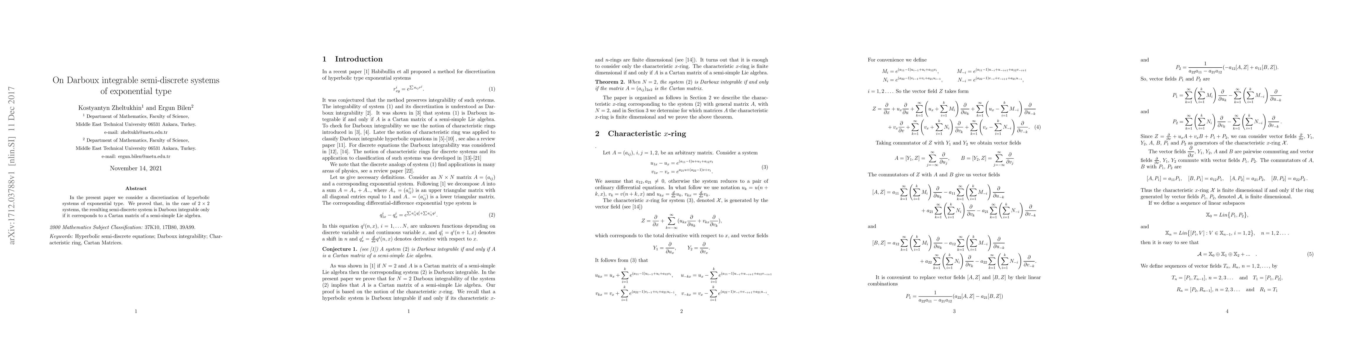 This paper investigates the discretization of hyperbolic systems of exponential type, demonstrating that $2\times 2$ semi-discrete systems are Darboux integrable only when they correspond to a Cartan matrix of a semi-simple Lie algebra.