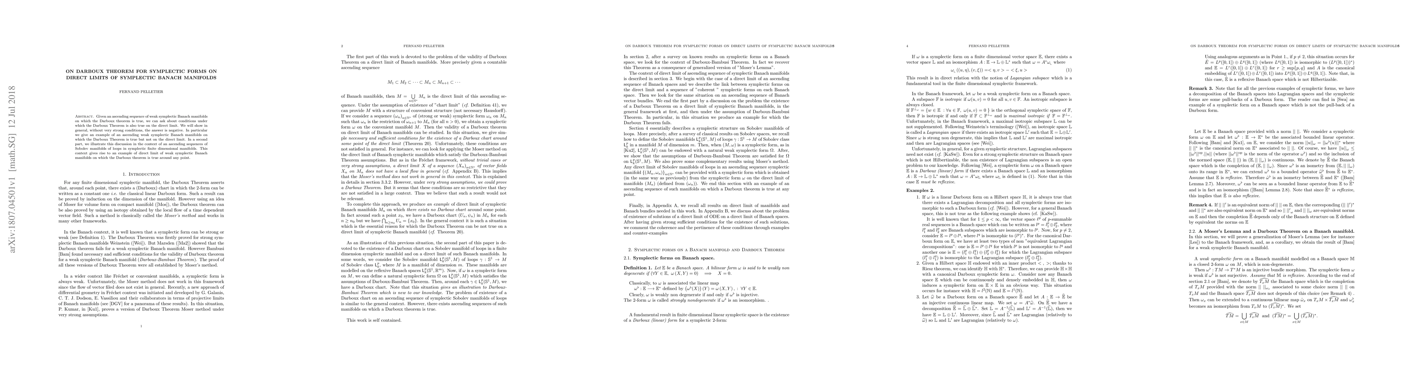 Given an ascending sequence of weak symplectic Banach manifolds on which the Darboux theorem is true, we can ask about conditions under which the Darboux Theorem is also true on the direct limit. We will show in general, without very strong conditions, the answer is negative. In particular we give an example of an ascending weak symplectic Banach manifolds on which the Darboux Theorem is true but not on the direct limit. In a second part, we illustrate this discussion in the context of an ascending sequences of Sobolev manifolds of loops in symplectic finite dimensional manifolds. This context gives rise to an example of direct limit of weak symplectic Banach manifolds on which the Darboux theorem is true around any point.