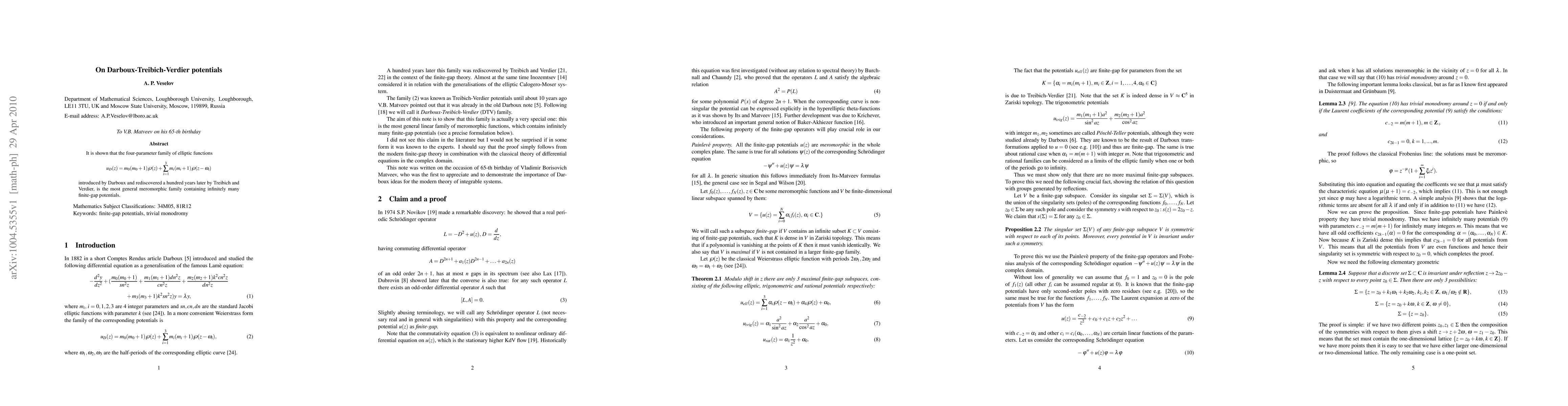 It is shown that the four-parameter family of elliptic functions $$u_D(z)=m_0(m_0+1)\wp(z)+\sum_{i=1}^3 m_i(m_i+1)\wp(z-\omega_i)$$ introduced by Darboux and rediscovered a hundred years later by Treibich and Verdier, is the most general meromorphic family containing infinitely many finite-gap potentials.