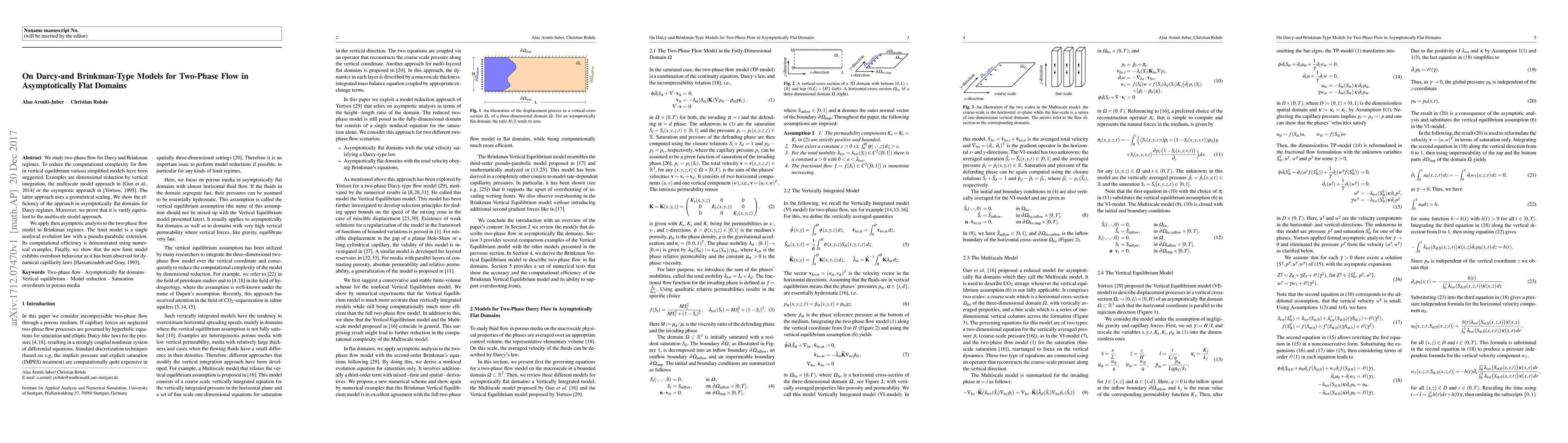 We study two-phase flow for Darcy and Brinkman regimes. To reduce the computational complexity for flow in vertical equilibrium various simplified models have been suggested. Examples are dimensional reduction by vertical integration, the multiscale model approach in [Guo et al., 2014] or the asymptotic approach in [Yortsos, 1995]. The latter approach uses a geometrical scaling. We show the efficiency of the approach in asymptotically flat domains for Darcy regimes. Moreover, we prove that it is vastly equivalent to the multiscale model approach. We apply then asymptotic analysis to the two-phase flow model in Brinkman regimes. The limit model is a single nonlocal evolution law with a pseudo-parabolic extension. Its computational efficiency is demonstrated using numerical examples. Finally, we show that the new limit model exhibits overshoot behaviour as it has been observed for dynamical capillarity laws [Hassanizadeh and Gray, 1993].