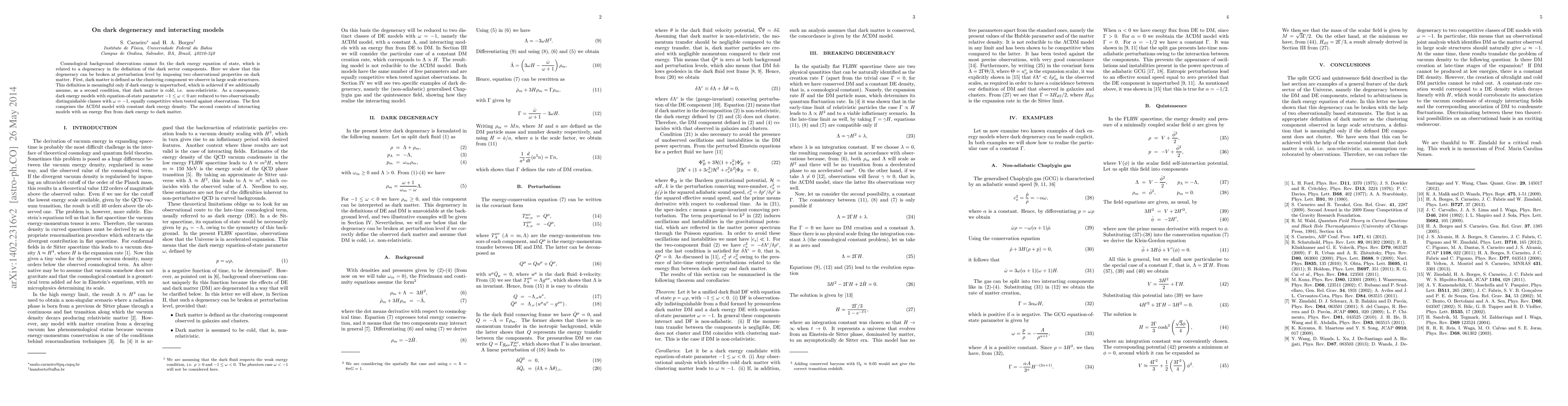 The paper presents a novel approach to breaking the dark degeneracy by defining dark matter as the clustering component and assuming it to be cold, leading to two observationally distinguishable classes of dark energy models with ω = -1.