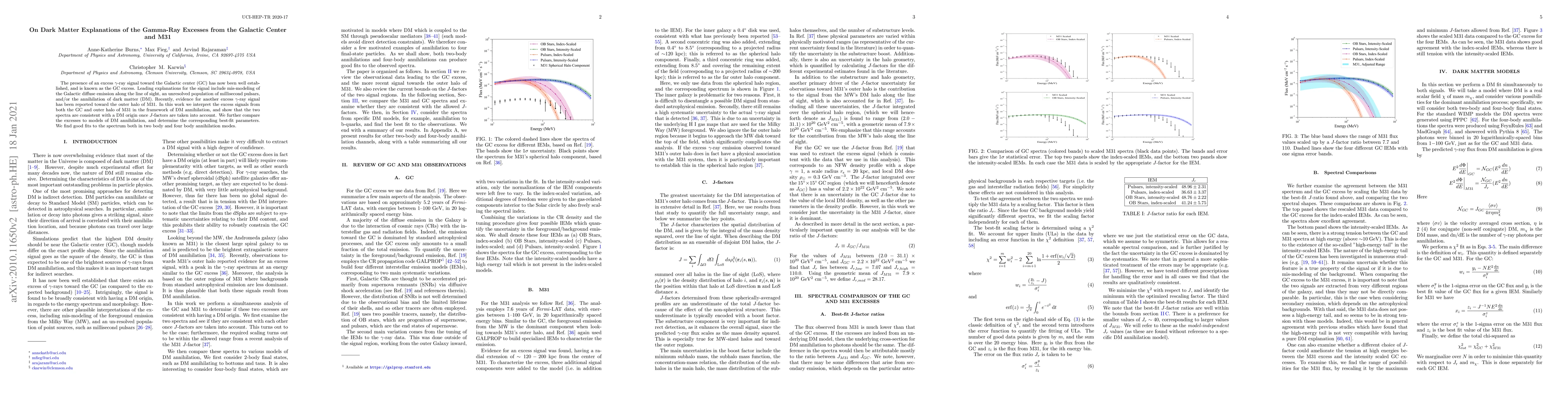 The presence of an excess gamma-ray signal toward the Galactic center (GC) has now been well established, and is known as the GC excess. Leading explanations for the signal include mis-modeling of the Galactic diffuse emission along the line of sight, an unresolved population of millisecond pulsars, and/or the annihilation of dark matter (DM). Recently, evidence for another excess gamma-ray signal has been reported toward the outer halo of M31. In this work we interpret the excess signals from both the GC and outer halo of M31 in the framework of DM annihilation, and show that the two spectra are consistent with a DM origin once J-factors are taken into account. We further compare the excesses to models of DM annihilation, and determine the corresponding best-fit parameters. We find good fits to the spectrum both in two body and four body annihilation modes.