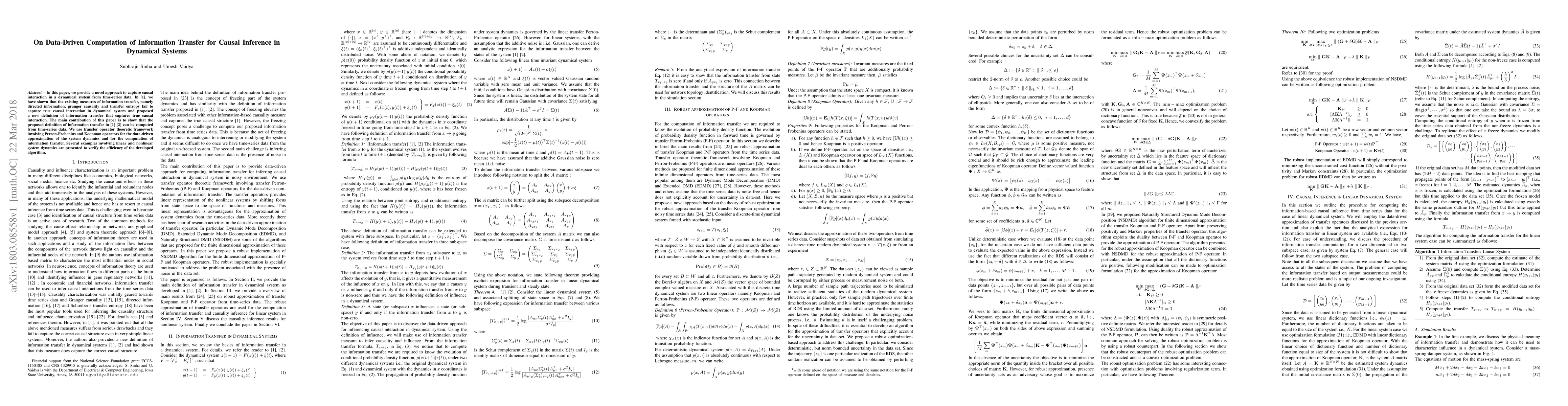 In this paper, we provide a novel approach to capture causal interaction in a dynamical system from time-series data. In \cite{sinha_IT_CDC2016}, we have shown that the existing measures of information transfer, namely directed information, granger causality and transfer entropy fail to capture true causal interaction in dynamical system and proposed a new definition of information transfer that captures true causal interaction. The main contribution of this paper is to show that the proposed definition of information transfer in \cite{sinha_IT_CDC2016}\cite{sinha_IT_ICC} can be computed from time-series data. We use transfer operator theoretic framework involving Perron-Frobenius and Koopman operators for the data-driven approximation of the system dynamics and for the computation of information transfer. Several examples involving linear and nonlinear system dynamics are presented to verify the efficiency of the developed algorithm.