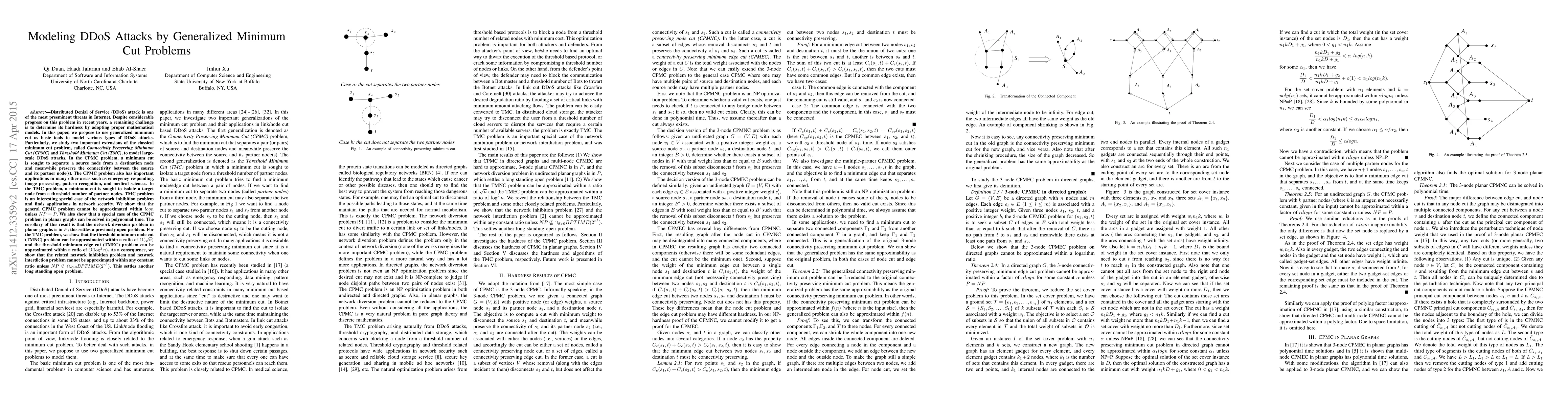 In this paper, we study two important extensions of the classical minimum cut problem, called {\em Connectivity Preserving Minimum Cut (CPMC)} problem and {\em Threshold Minimum Cut (TMC)} problem, which have important applications in large-scale DDoS attacks. In CPMC problem, a minimum cut is sought to separate a of source from a destination node and meanwhile preserve the connectivity between the source and its partner node(s). The CPMC problem also has important applications in many other areas such as emergency responding, image processing, pattern recognition, and medical sciences. In TMC problem, a minimum cut is sought to isolate a target node from a threshold number of partner nodes. TMC problem is an important special case of network inhibition problem and has important applications in network security. We show that the general CPMC problem cannot be approximated within $logn$ unless $NP=P$ has quasi-polynomial algorithms. We also show that a special case of two group CPMC problem in planar graphs can be solved in polynomial time. The corollary of this result is that the network diversion problem in planar graphs is in $P$, a previously open problem. We show that the threshold minimum node cut (TMNC) problem can be approximated within ratio $O(\sqrt{n})$ and the threshold minimum edge cut problem (TMEC) can be approximated within ratio $O(\log^2{n})$. \emph{We also answer another long standing open problem: the hardness of the network inhibition problem and network interdiction problem. We show that both of them cannot be approximated within any constant ratio. unless $NP \nsubseteq \cap_{\delta>0} BPTIME(2^{n^{\delta}})$.