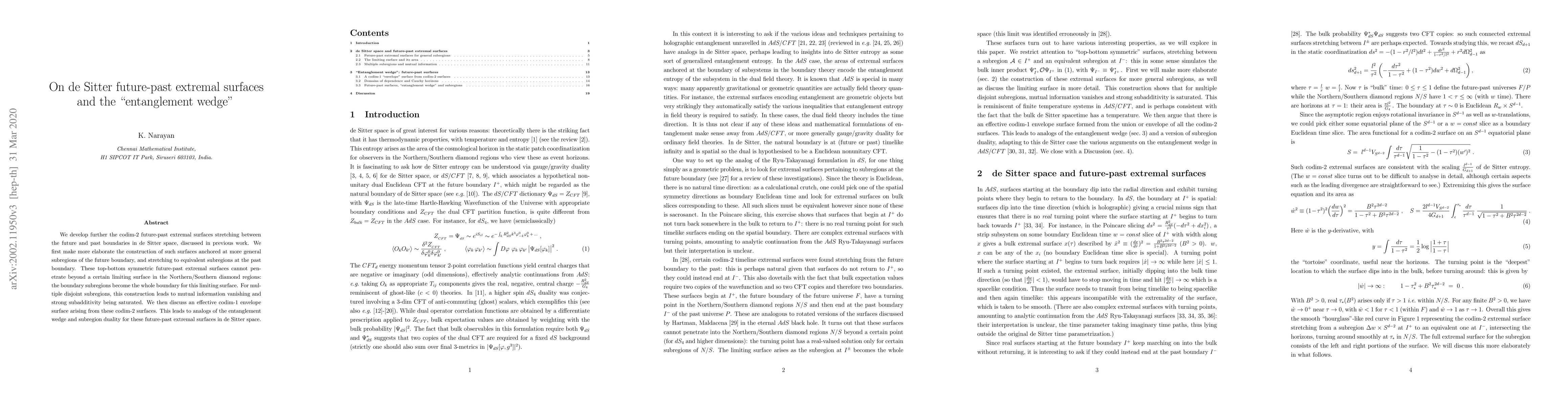 This paper elaborates on future-past extremal surfaces in de Sitter space, showing how they relate to subregions and the entanglement wedge, leading to strong subadditivity and mutual information vanishing for multiple disjoint regions. It also introduces an effective codimension-1 envelope surface that mirrors entanglement wedge concepts in this context.