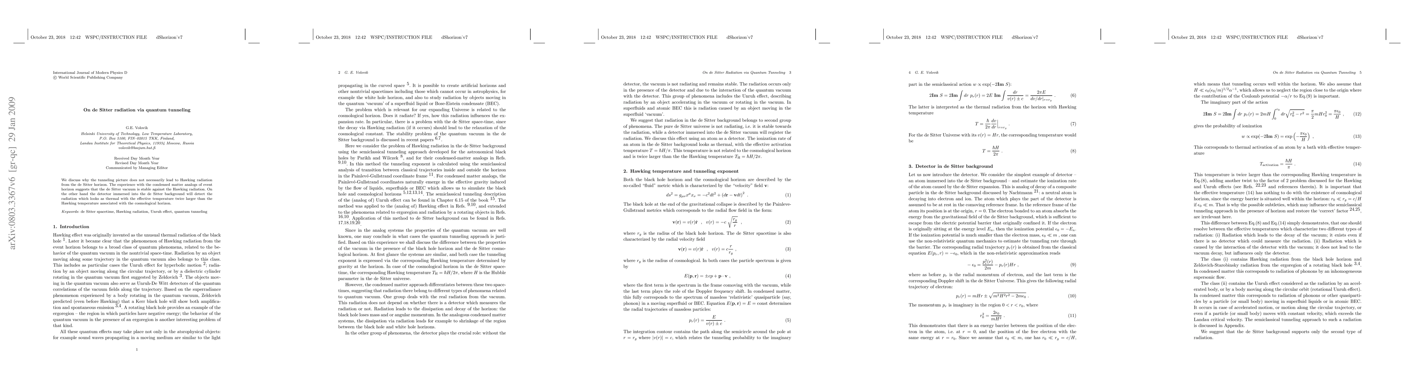We discuss why the tunneling picture does not necessarily lead to Hawking radiation from the de Sitter horizon. The experience with the condensed matter analogs of event horizon suggests that the de Sitter vacuum is stable against the Hawking radiation. On the other hand the detector immersed into the de Sitter background will detect the radiation which looks as thermal with the effective temperature twice larger than the Hawking temperature associated with the cosmological horizon.
