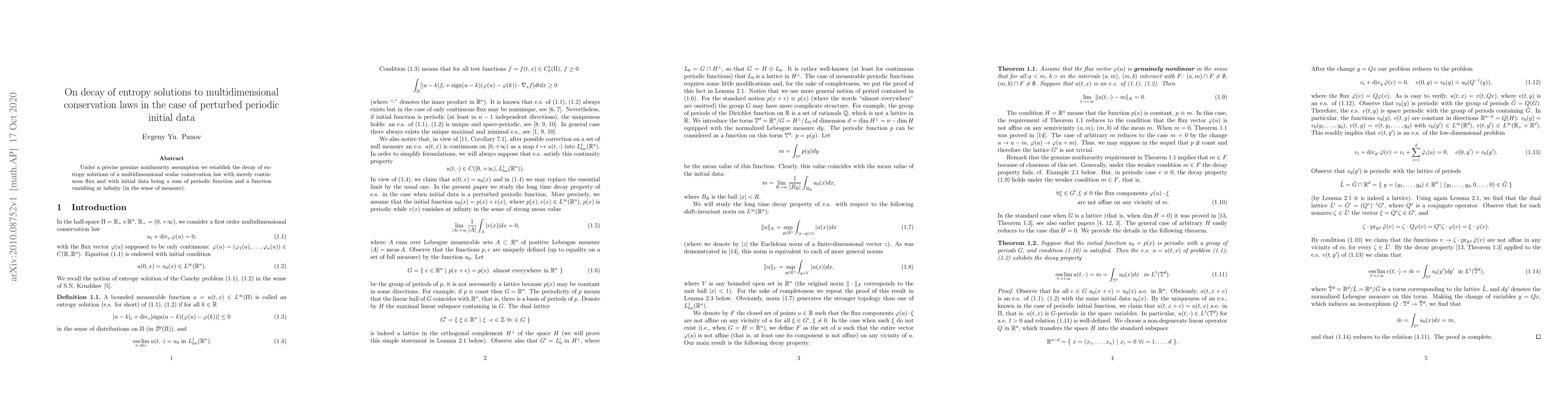 Summary: This paper proves the decay of entropy solutions for multidimensional scalar conservation laws under genuine nonlinearity, given initial data that combines a periodic function and a vanishing function, even when the flux is merely continuous. The decay behavior is established despite the perturbations in the initial data.
