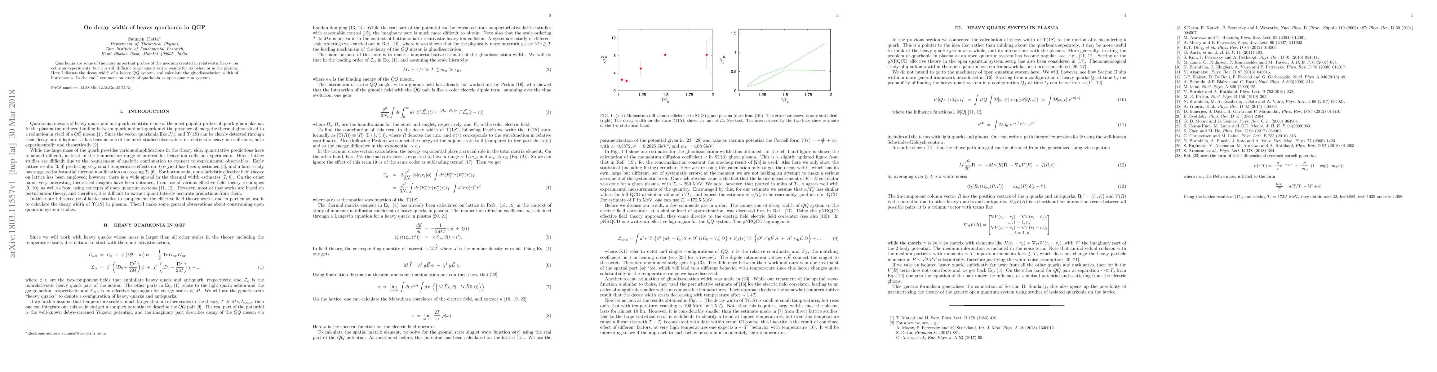 Quarkonia are some of the most important probes of the medium created in relativistic heavy ion collision experiments, but it is still difficult to get quantitative results for its behavior in the plasma. Here I discuss the decay width of a heavy quarkonium system, and calculate the gluodissociation width of bottomonia. In the end I comment on study of quarkonia as open quantum systems.