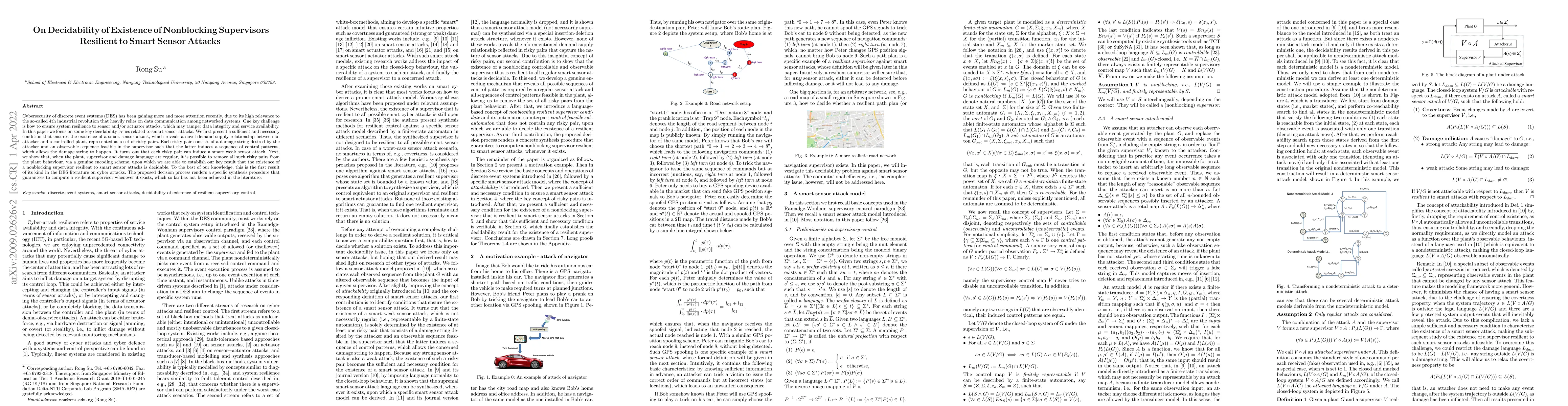 Cybersecurity of discrete event systems (DES) has been gaining more and more attention recently, due to its high relevance to the so-called 4th industrial revolution that heavily relies on data communication among networked systems. One key challenge is how to ensure system resilience to sensor and/or actuator attacks, which may tamper data integrity and service availability. In this paper we focus on some key decidability issues related to smart sensor attacks. We first present a sufficient and necessary condition that ensures the existence of a smart sensor attack, which reveals a novel demand-supply relationship between an attacker and a controlled plant, represented as a set of risky pairs. Each risky pair consists of a damage string desired by the attacker and an observable sequence feasible in the supervisor such that the latter induces a sequence of control patterns, which allows the damage string to happen. It turns out that each risky pair can induce a smart weak sensor attack. Next, we show that, when the plant, supervisor and damage language are regular, it is computationally feasible to remove all such risky pairs from the plant behaviour, via a genuine encoding scheme, upon which we are able to establish our key result that the existence of a nonblocking supervisor resilient to smart sensor attacks is decidable. To the best of our knowledge, this is the first result of its kind in the DES literature on cyber attacks. The proposed decision process renders a specific synthesis procedure that guarantees to compute a resilient supervisor whenever it exists, which so far has not been achieved in the literature.