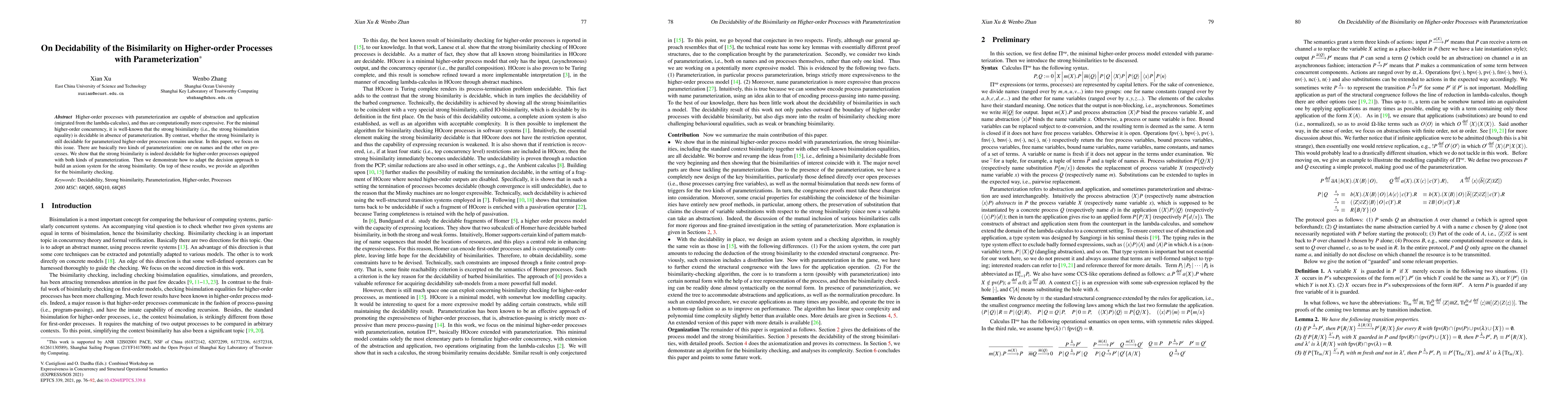This paper investigates the decidability of strong bisimilarity for higher-order processes with parameterization, proving that it remains decidable even with both name and process parameterization. It also presents an algorithm for bisimilarity checking and an adapted axiom system for the strong bisimilarity.