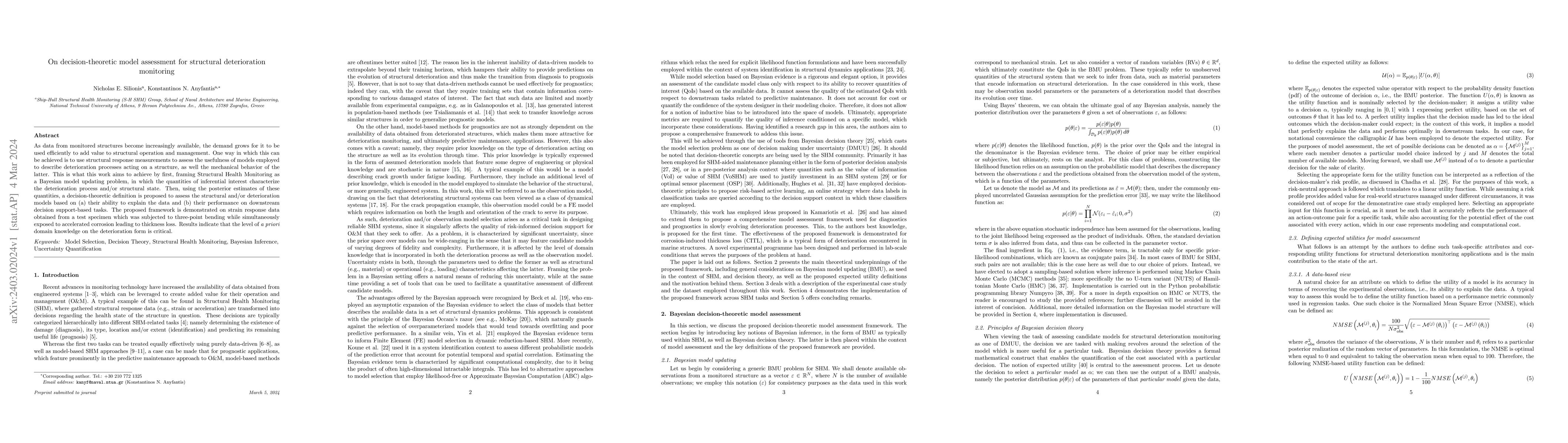 As data from monitored structures become increasingly available, the demand grows for it to be used efficiently to add value to structural operation and management. One way in which this can be achieved is to use structural response measurements to assess the usefulness of models employed to describe deterioration processes acting on a structure, as well the mechanical behavior of the latter. This is what this work aims to achieve by first, framing Structural Health Monitoring as a Bayesian model updating problem, in which the quantities of inferential interest characterize the deterioration process and/or structural state. Then, using the posterior estimates of these quantities, a decision-theoretic definition is proposed to assess the structural and/or deterioration models based on (a) their ability to explain the data and (b) their performance on downstream decision support-based tasks. The proposed framework is demonstrated on strain response data obtained from a test specimen which was subjected to three-point bending while simultaneously exposed to accelerated corrosion leading to thickness loss. Results indicate that the level of \textit{a priori} domain knowledge on the deterioration form is critical.