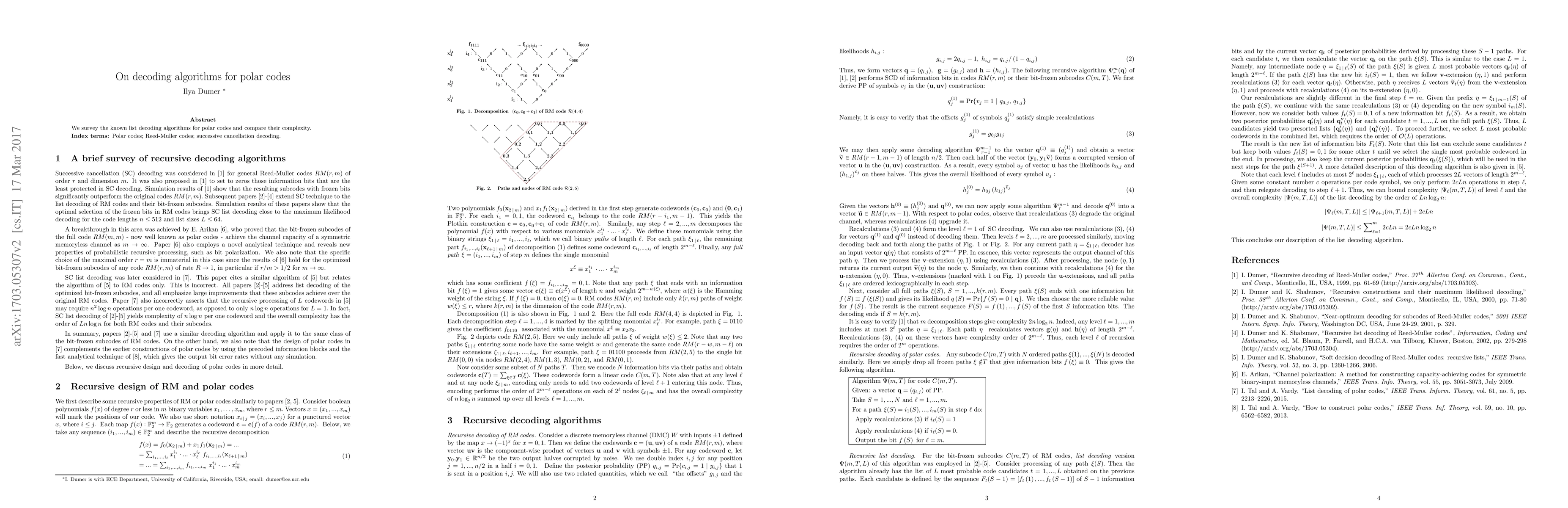 Summary: This paper surveys various list decoding algorithms for polar codes and evaluates their complexity. The focus is on comparing different approaches to decoding in terms of computational efficiency.