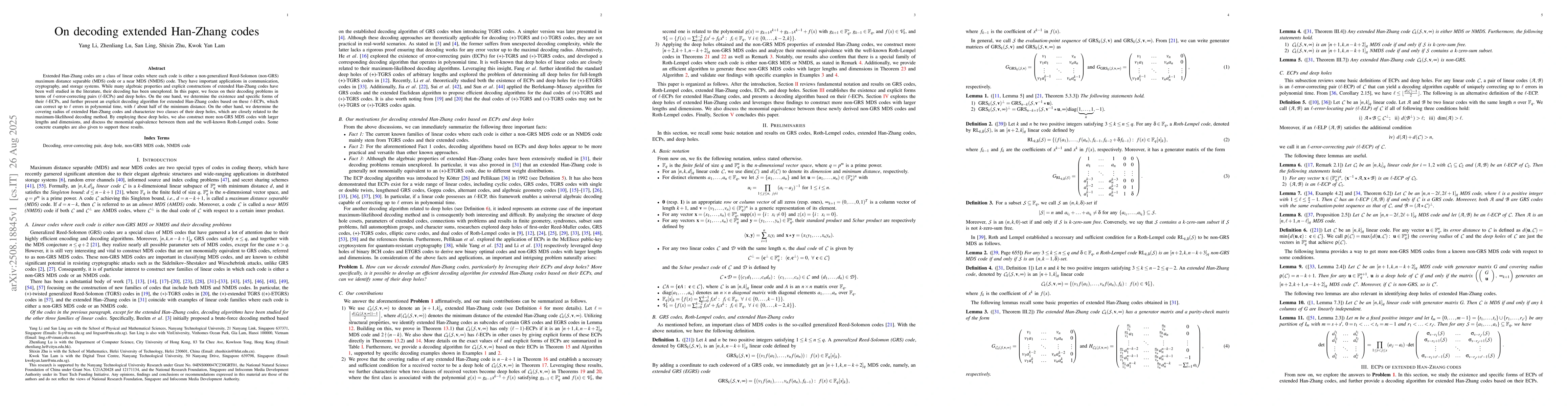 Extended Han-Zhang codes are a class of linear codes where each code is either a non-generalized Reed-Solomon (non-GRS) maximum distance separable (MDS) code or a near MDS (NMDS) code. They have important applications in communication, cryptography, and storage systems. While many algebraic properties and explicit constructions of extended Han-Zhang codes have been well studied in the literature, their decoding has been unexplored. In this paper, we focus on their decoding problems in terms of $\ell$-error-correcting pairs ($\ell$-ECPs) and deep holes. On the one hand, we determine the existence and specific forms of their $\ell$-ECPs, and further present an explicit decoding algorithm for extended Han-Zhang codes based on these $\ell$-ECPs, which can correct up to $\ell$ errors in polynomial time, with $\ell$ about half of the minimum distance. On the other hand, we determine the covering radius of extended Han-Zhang codes and characterize two classes of their deep holes, which are closely related to the maximum-likelihood decoding method. By employing these deep holes, we also construct more non-GRS MDS codes with larger lengths and dimensions, and discuss the monomial equivalence between them and the well-known Roth-Lempel codes. Some concrete examples are also given to support these results.