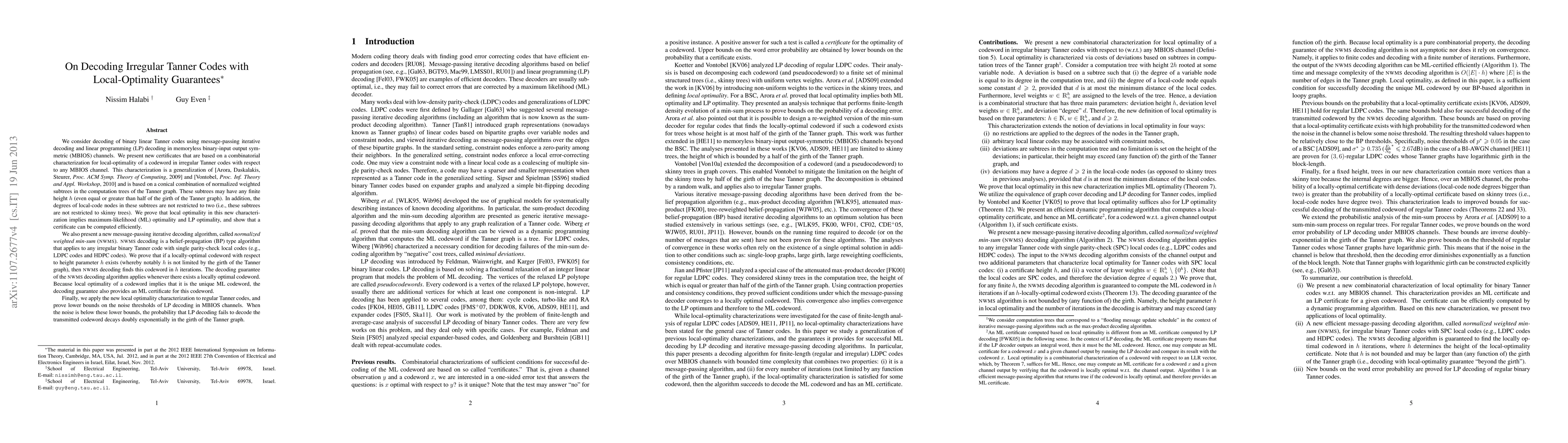 Researchers develop a new characterization for local optimality in irregular Tanner codes, which implies maximum-likelihood and LP optimality, and propose an efficient decoding algorithm that guarantees finding the locally optimal codeword within a limited number of iterations.