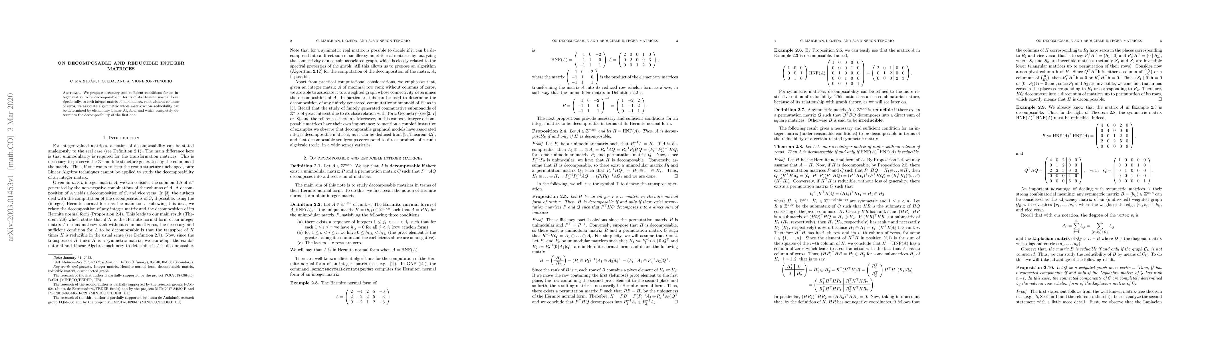 We propose necessary and sufficient conditions for an integer matrix to be decomposable in terms of its Hermite normal form. Specifically, to each integer matrix of maximal row rank without columns of zeros, we associate a symmetric whole matrix whose reducibility can be determined by elementary Linear Algebra, and which completely determines the decomposibility of the first one.